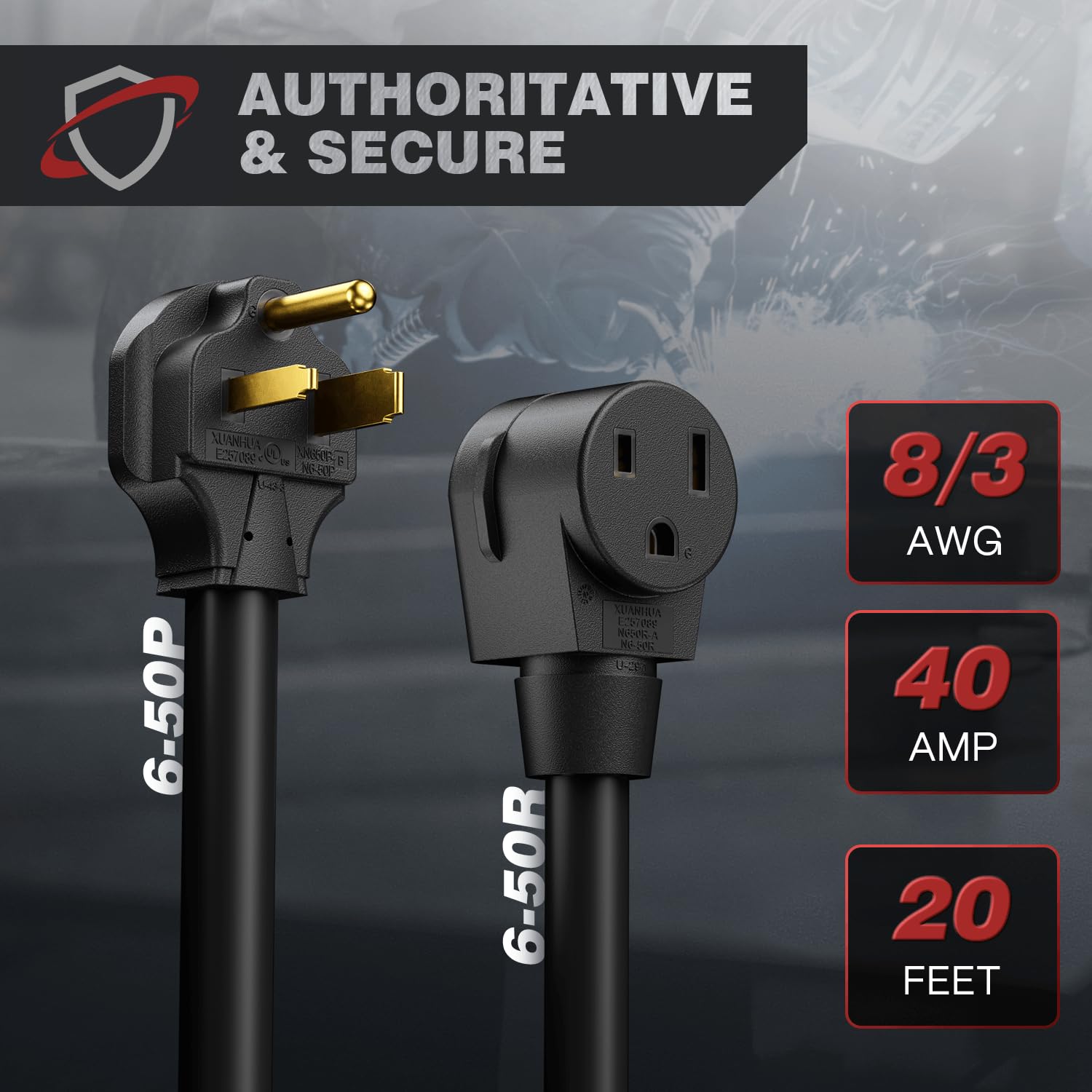 - AUTHORITATIVE & SAFE: This professional 220v extension cord has great performance: 20ft length provides a safe distance from the power source. 8AWG(wire gauge), 40Amp, 3 conductors, NEMA 6-50P to 6-50R. Unlike other products on the market, Our 240V extension cords meet authoritative safety standards, ensuring a safe and reliable power supply in any environment.