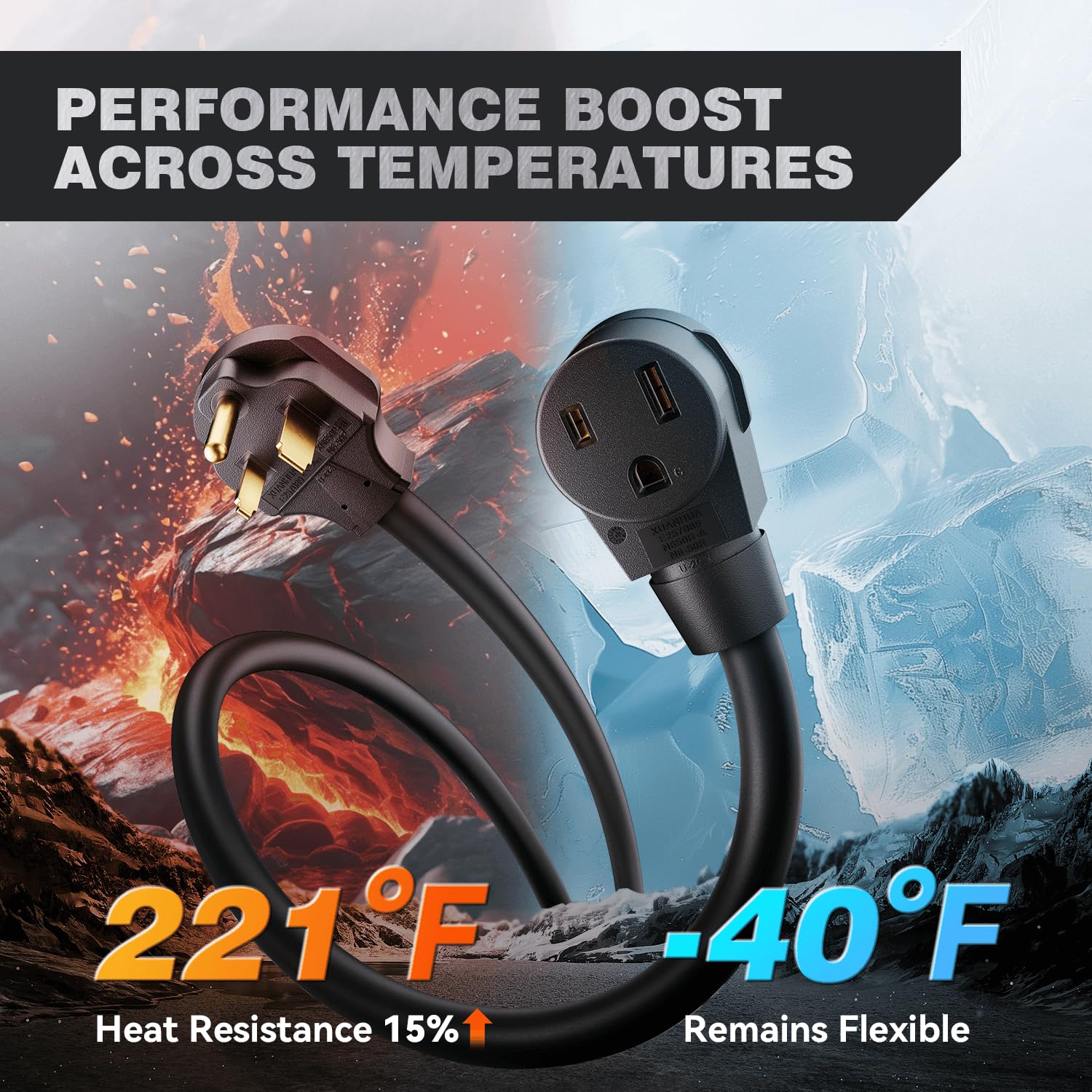 - PERFORMANCE BOOST ACROSS TEMPERATURES: Operating temperatures range from -40℃ to +105°C(40℉ to +221℉ ). Compared to other welding extension cord that can only reach a maximum heat resistance of +90℃ (194℉), heat resistance of our nema 6-50 extension cord is increased by 15%. At -40℃ , most extension cords will become stiff, but our extension cords can still remain flexible.