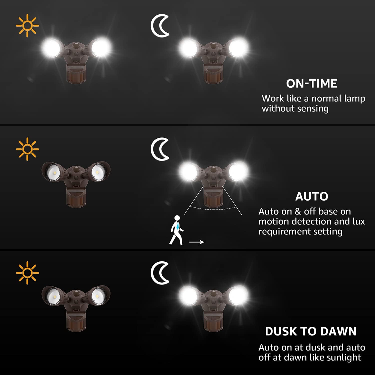 - Support 3 Working Modes: On-Time Mode allows manual control on and off of the light;AUTO mode:when movement is detected in darkness the light will turn on & after 5 seconds to 5 minutes it will turn off depending on your setting on the “Time” knob; D2D(Dusk To Dawn) Mode will automatically turns on at night and stays off at daytime, work only in the night.