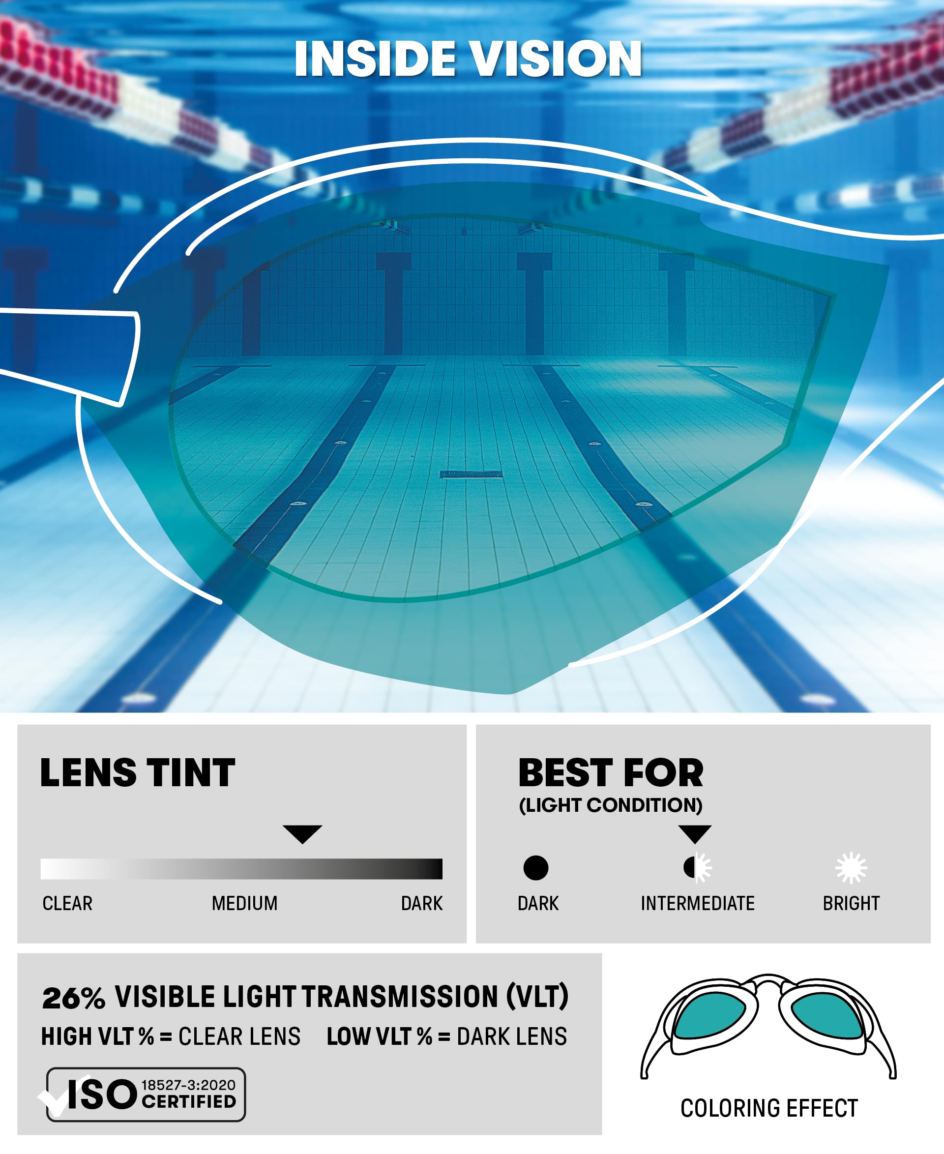 - Low profile racing goggles designed for a tight fit in the eye socket, prioritizing hydrodynamics and stability, with a thin gasket (over molded on lens) for perfect comfort and watertight seal