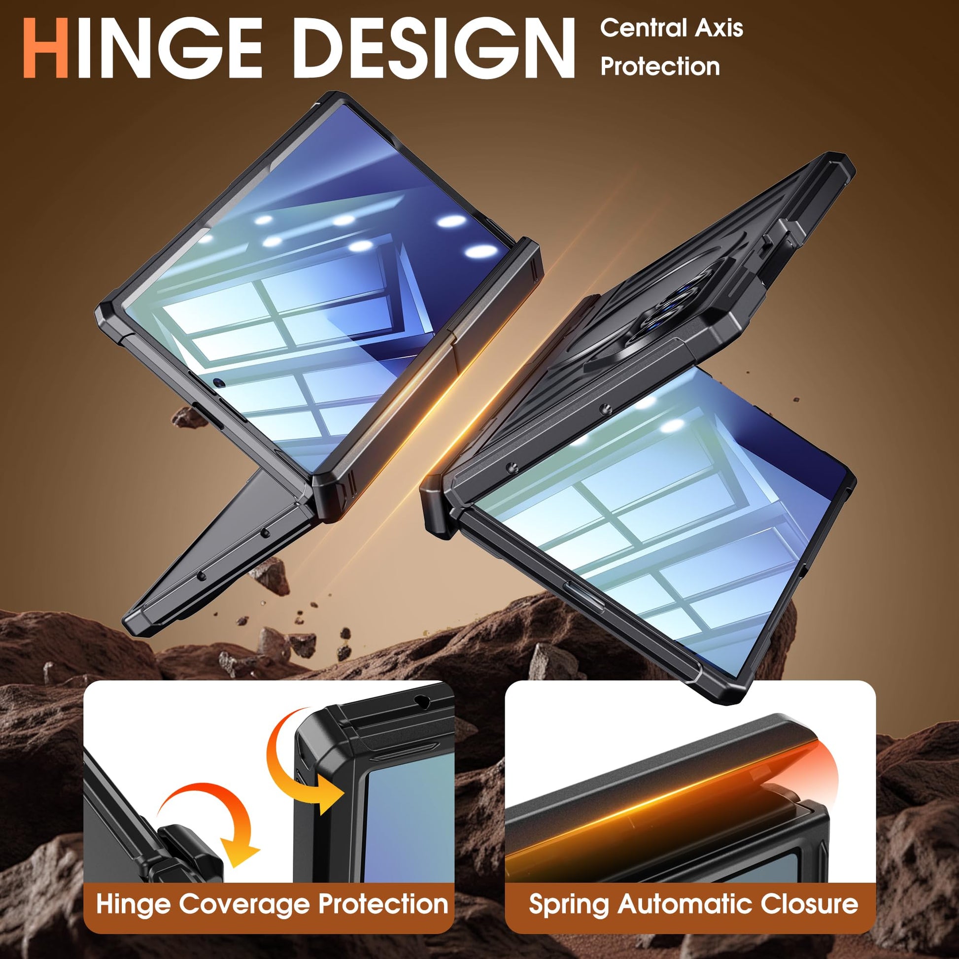 - Reinforced Hinge Protection: This Samsung Z Fold 7 case features a hardened steel spring mechanism that automatically snaps shut when folded, adding reinforced protection specifically to the Fold7's external vulnerable points. The hardened steel spring enhances drop protection by 200% compared to other cases while maintaining a seamless fit