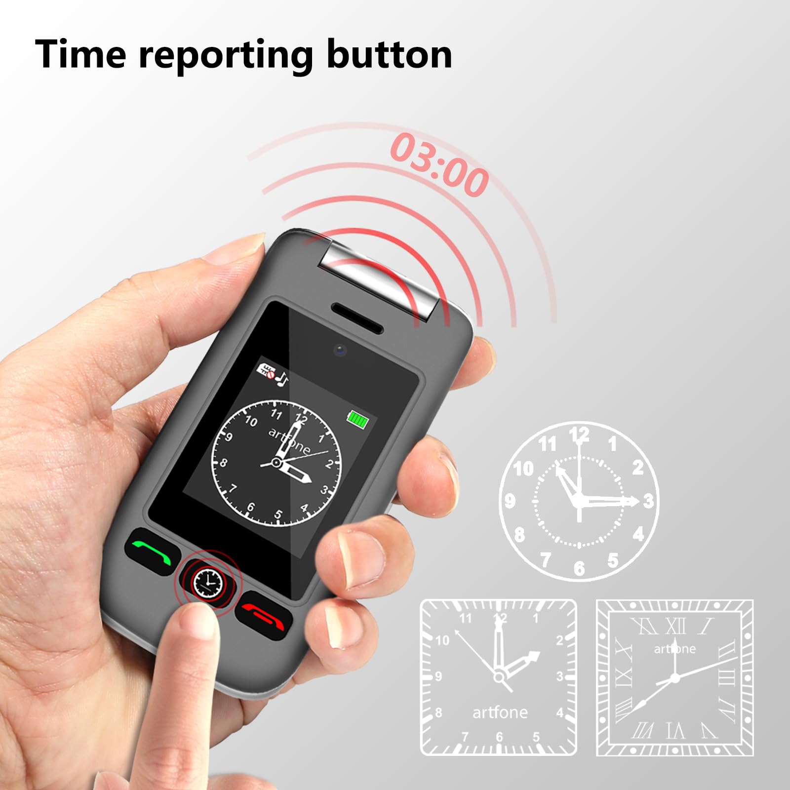 - 【Photo ID and Multilingual Time Announcements】The Artfone G6 allows users to associate contact numbers with photos, making it easier to identify incoming calls visually. Additionally, the external screen's alarm button can announce the time in multiple languages, catering to users with poor eyesight. This feature makes it simple for seniors to keep track of time and identify callers without straining their vision, ensuring they remain informed and in control.