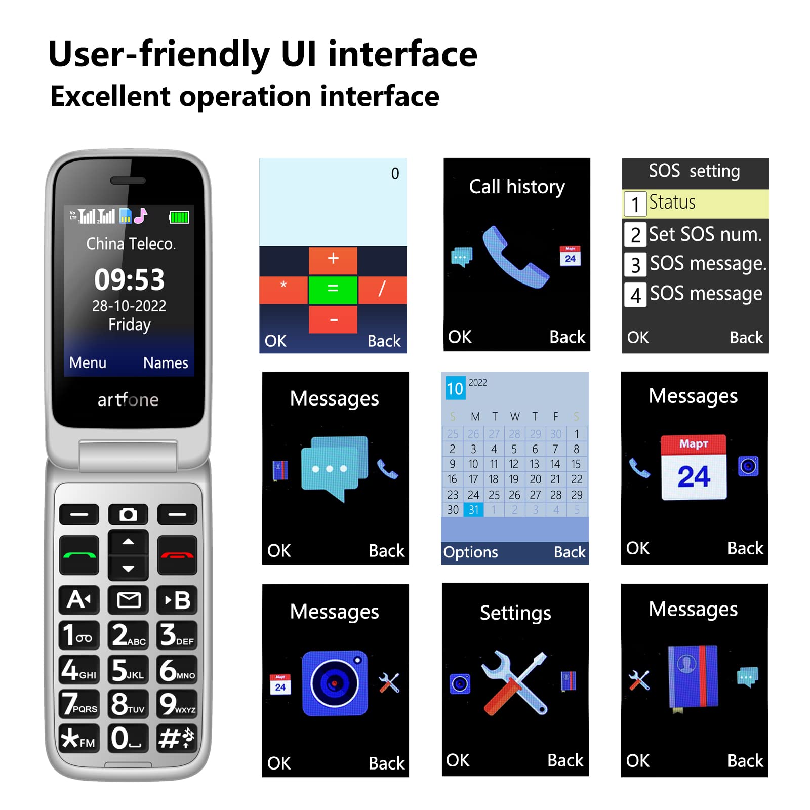 - 【Dual Color Screens for Effortless Use】The Artfone G6 boasts a dual-color screen setup with a 2.4-inch high-definition internal display and a 1.8-inch external color screen. The large fonts and icons make it easy to view, while the outer screen displays crucial information like date, time, and contacts without opening the phone. This allows users to take calls directly and view essential details at a glance.