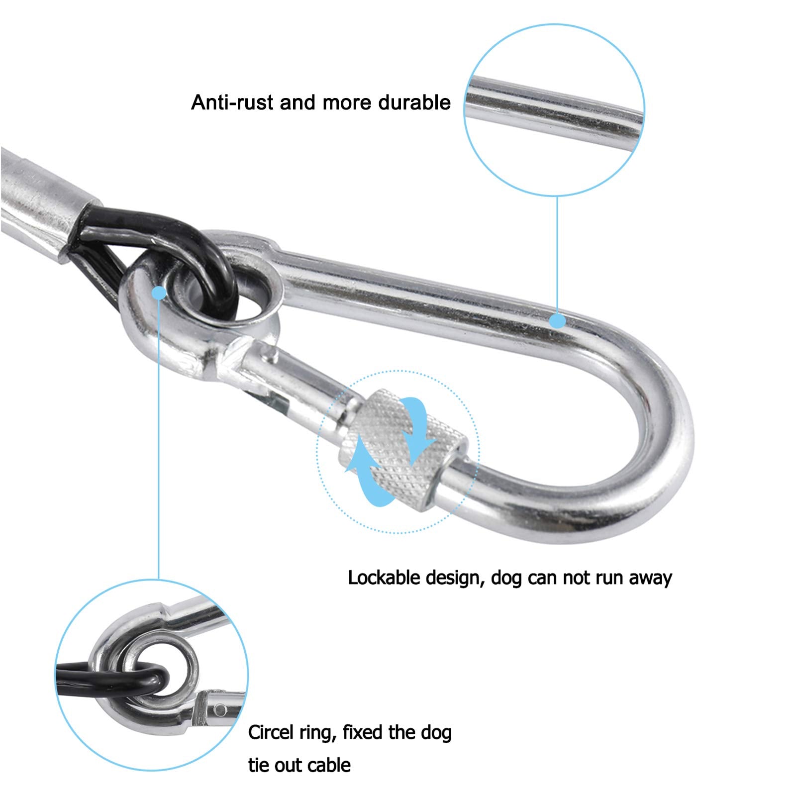 - 【New Design】The tie out cable length is 100ft, diameter is 1/8" without the vinyl coating, with 2 snap fasteners. It can withstand up to 300lbs, suitable for large dogs.