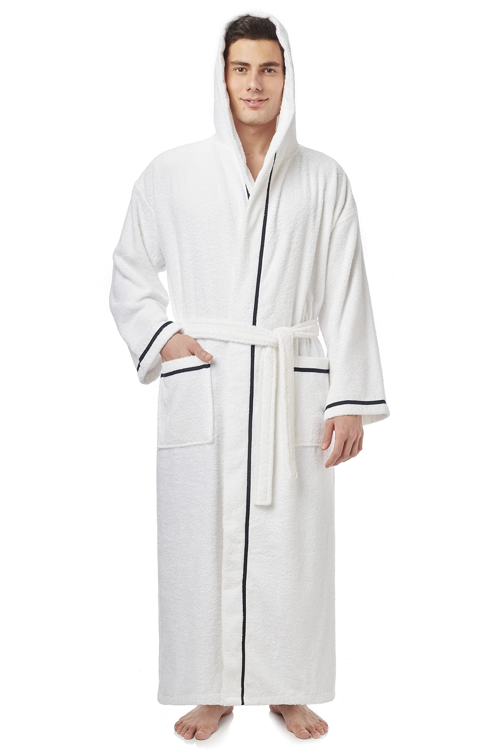 Arus Men's Hooded Classic Bathrobe Turkish Cotton Robe with Full Length Options, White With Navy Blue Border, Large-X-Large Extra Tall