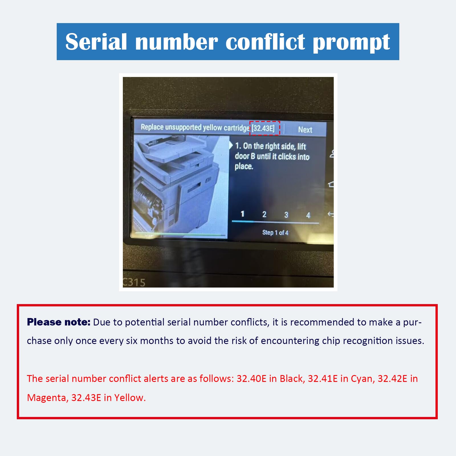 - Package Contents - - Include 4 packs compatible toner cartridges for Xerox C310 C315 with Lastest Chip, 006R04356 for Black, 006R04356 for Cyan, 006R04356 for Magenta, 006R04356 for Yellow.