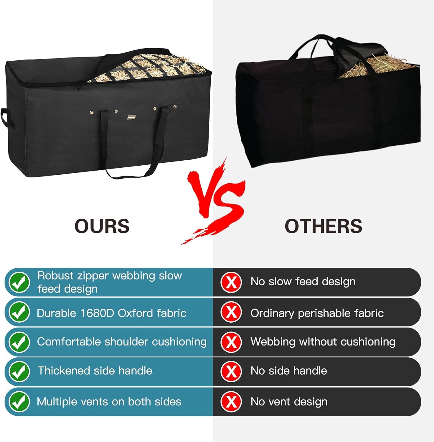 - 【Portable Design for Easy Transportation】Equipped with padded webbing and sturdy side carry handles, this hay bag is easy to move and transport. The three-sided all-wrapped zipper seal is convenient to open and close, which effectively prevents hay from falling during transportation, keeping your vehicle and stable clean and tidy. The sturdy handles and practical zipper design greatly enhance the portability and usability of the product.