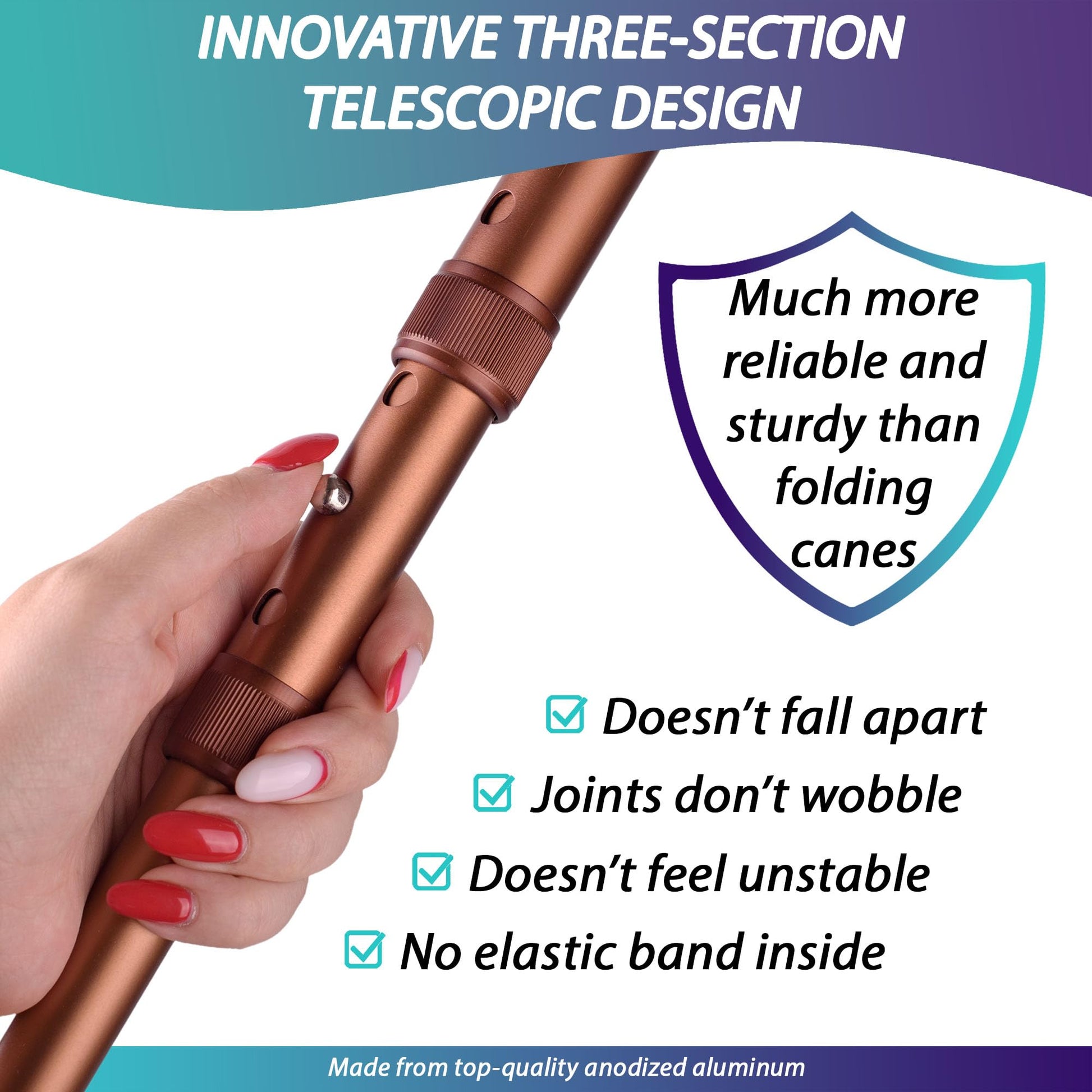 - ADJUSTABLE CANE LENGTH TO AVOID SPINE PAIN. This cane for women adjusts from 73.5 cm to 91.5 cm to ensure the proper length according to your height and prevent spine pain due to incorrect posture. Enjoy significantly better balance! Enhanced with an innovative telescopic solution, Asterom Canes are much more secure, reliable, and comfortable than standard folding canes.