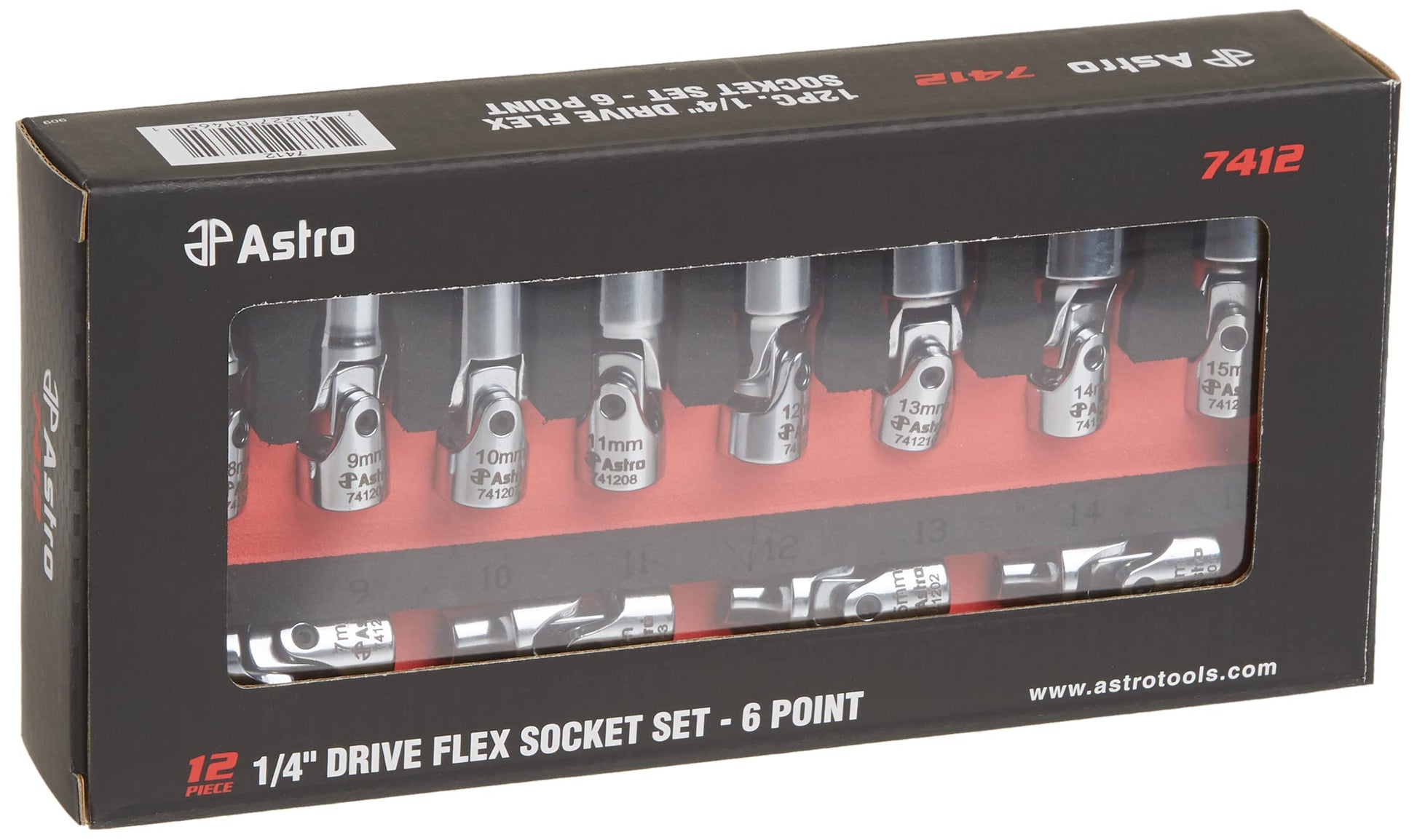 The Astro Pneumatic 7412 - 12 -Piece. 1/4-Inch Dr. 6 Pt. Metric Flex Socket Set features surface drive technology that grips fasteners on the flats for greater torque transmission without rounding. Flexible joints make it versatile for hard to reach fasteners. Full polish finish for a crisp look. Set includes: 5mm, 5.5mm, 6mm, 7mm, 8mm, 9mm, 10mm, 11mm, 12mm, 13mm, 14mm, 15mm Flex Sockets.
