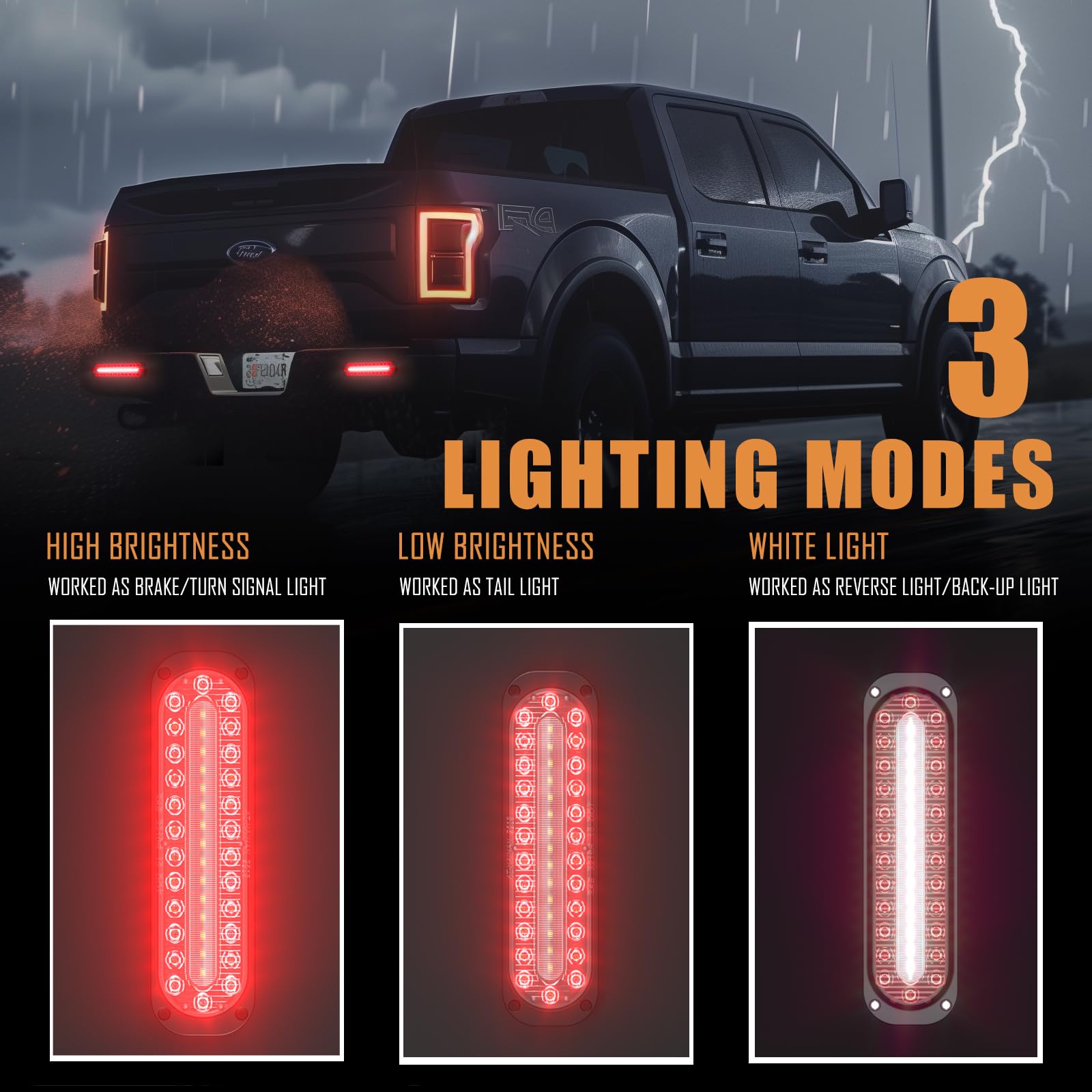 - DOT compliant safety light; built-in 26 PCS red SMD LEDs and 15 PCS white SMD LEDs, features premium optics to output super bright red and white light. High brightness for turn or brake lights (red) and low brightness for tail lights (red); white light for reverse / back-up lights (white); making them ideal for front or rear vehicle applications, improve visibility at night, in fog or raining day