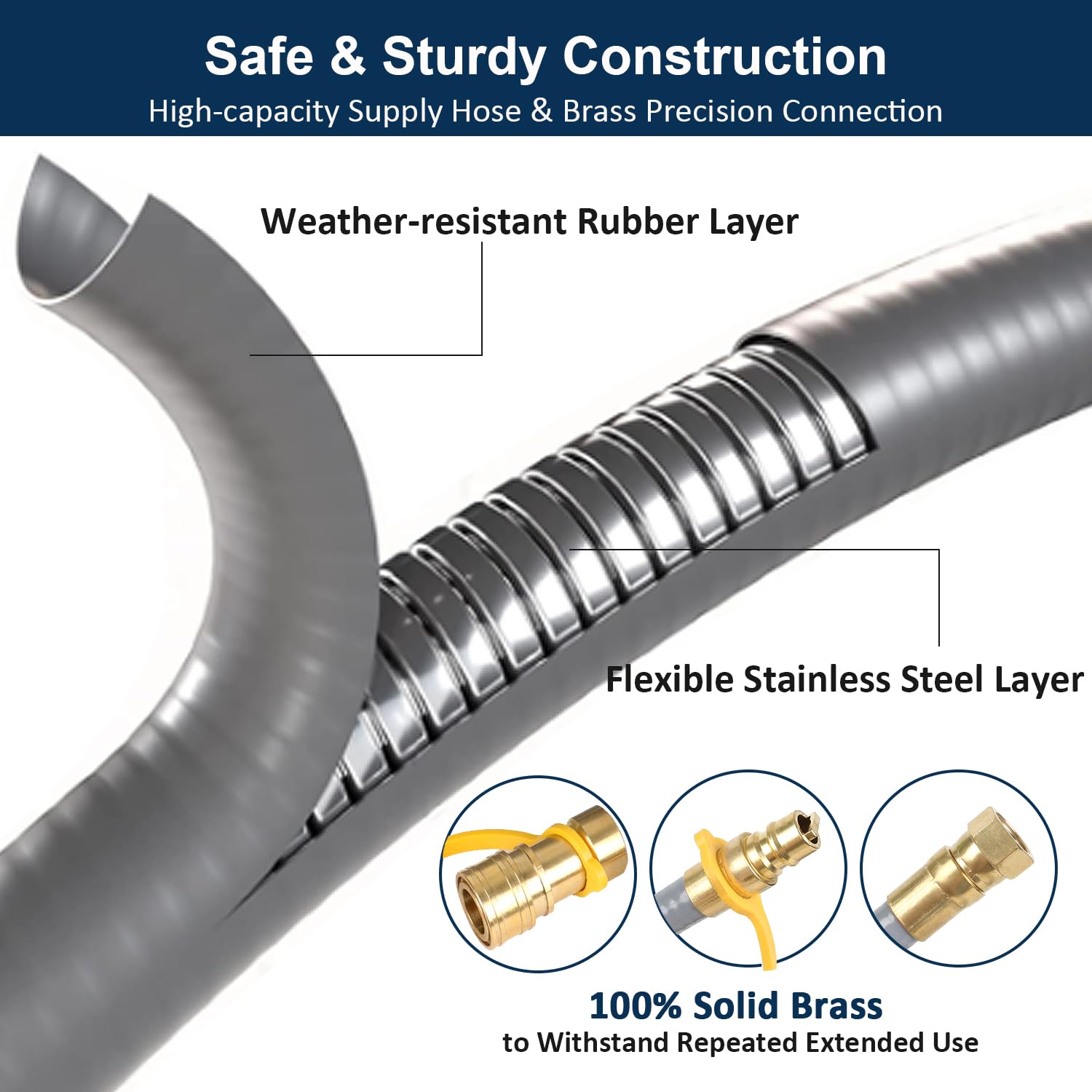 - Premium Quality for Long-lasting Usage. High-capacity natural gas supply hose and brass precision connection with dust cap and plug, make sure excellent sealing quality and durability. Quick connect adapter and fittings of gas quick connect hose are constructed of brass to withstand repeated, extended use. 50, 000 BTU/hour maximum capacity. CSA certificated.