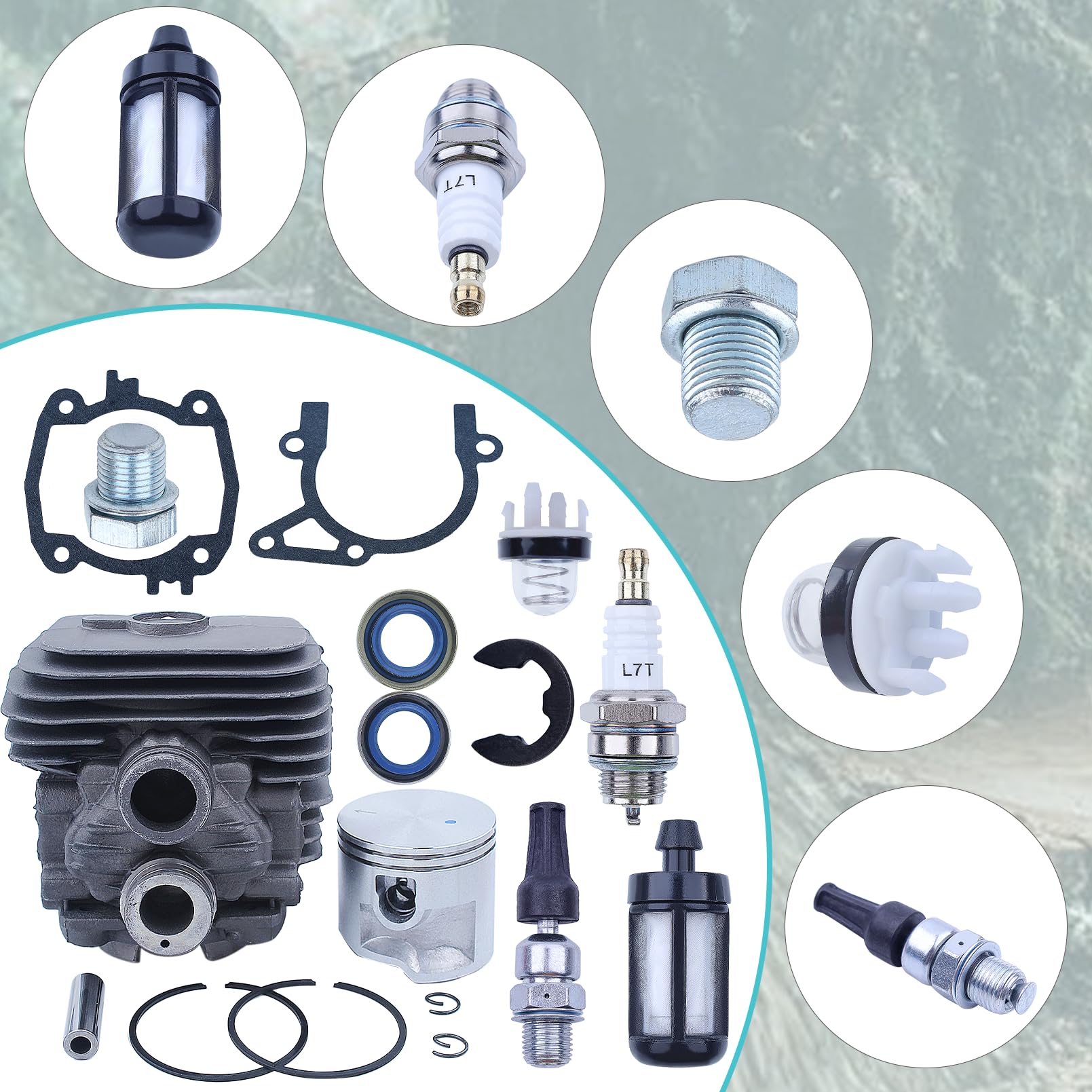 - You will get 1pc cylinder piston kit, 1pc spark plug, 1pc decompression valve, 1pc plug, 1pc fuel filter, 1pc primer bulb, 2pc oil seal, 2pc gasket, 1pc e-clip.