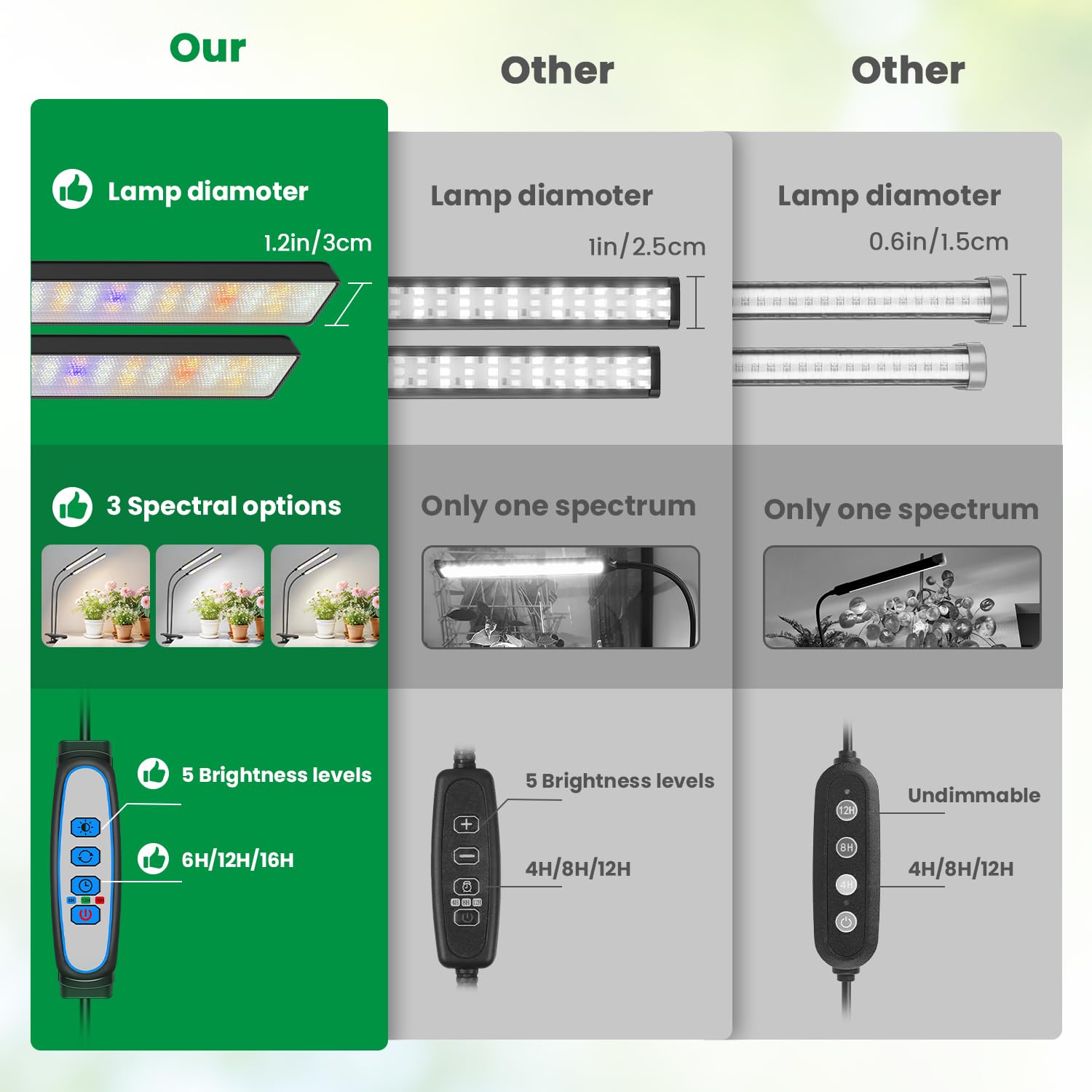 - Grow Light with Timer: This plant grow light has 6/12/16 hours options. We know that in some areas during certain seasons, days are shorter and nights are longer. So we upgraded the timed option to 16 hours to provide a longer light cycle for your plants.