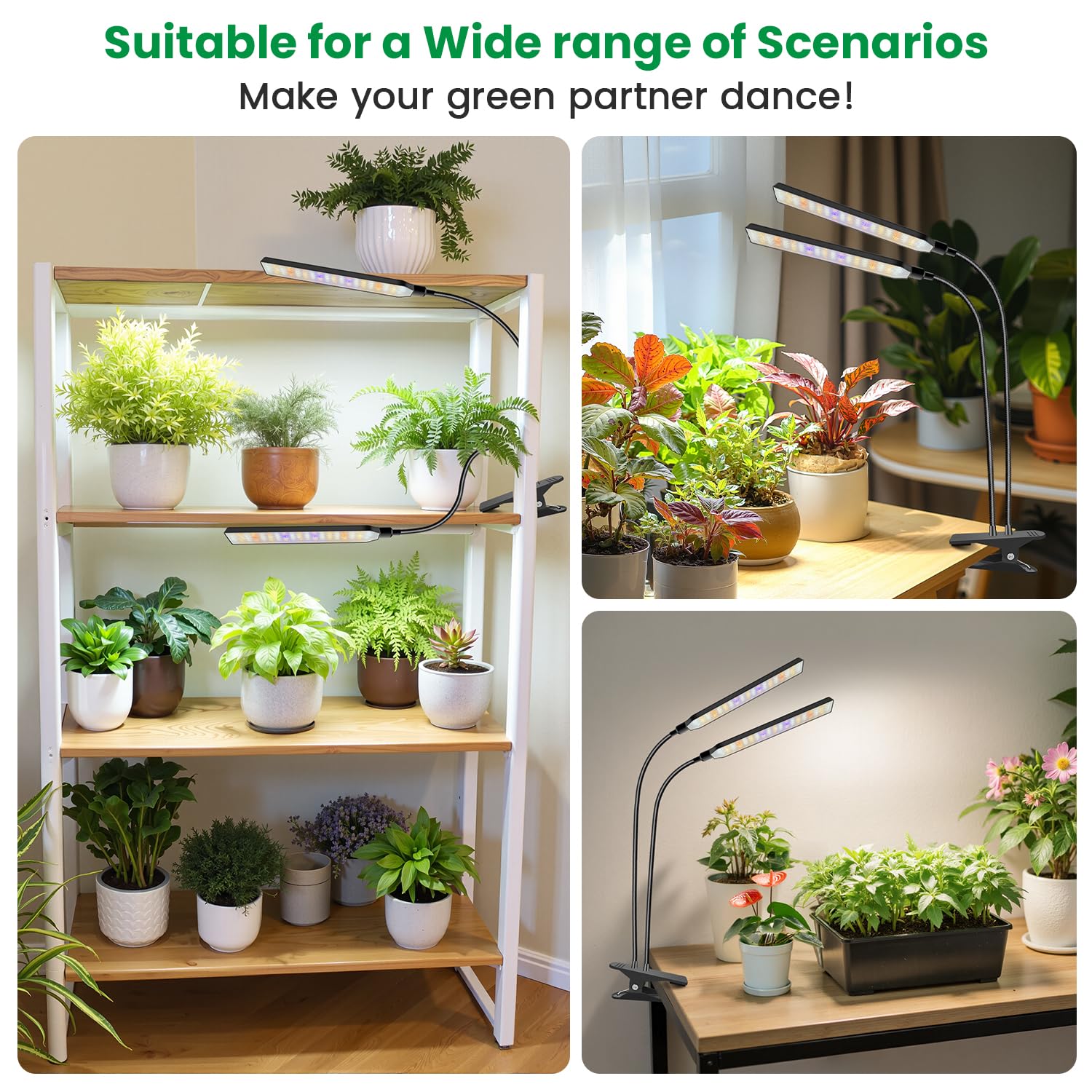- Multi-Situation Flexible Use: This plant light for indoor growing has a 2-head design with a flexible gooseneck tube and sturdy clamp, which allows it to be used on any object such as table tops, shelves, cabinets, etc., and it is easy to direct the light to multiple plants.