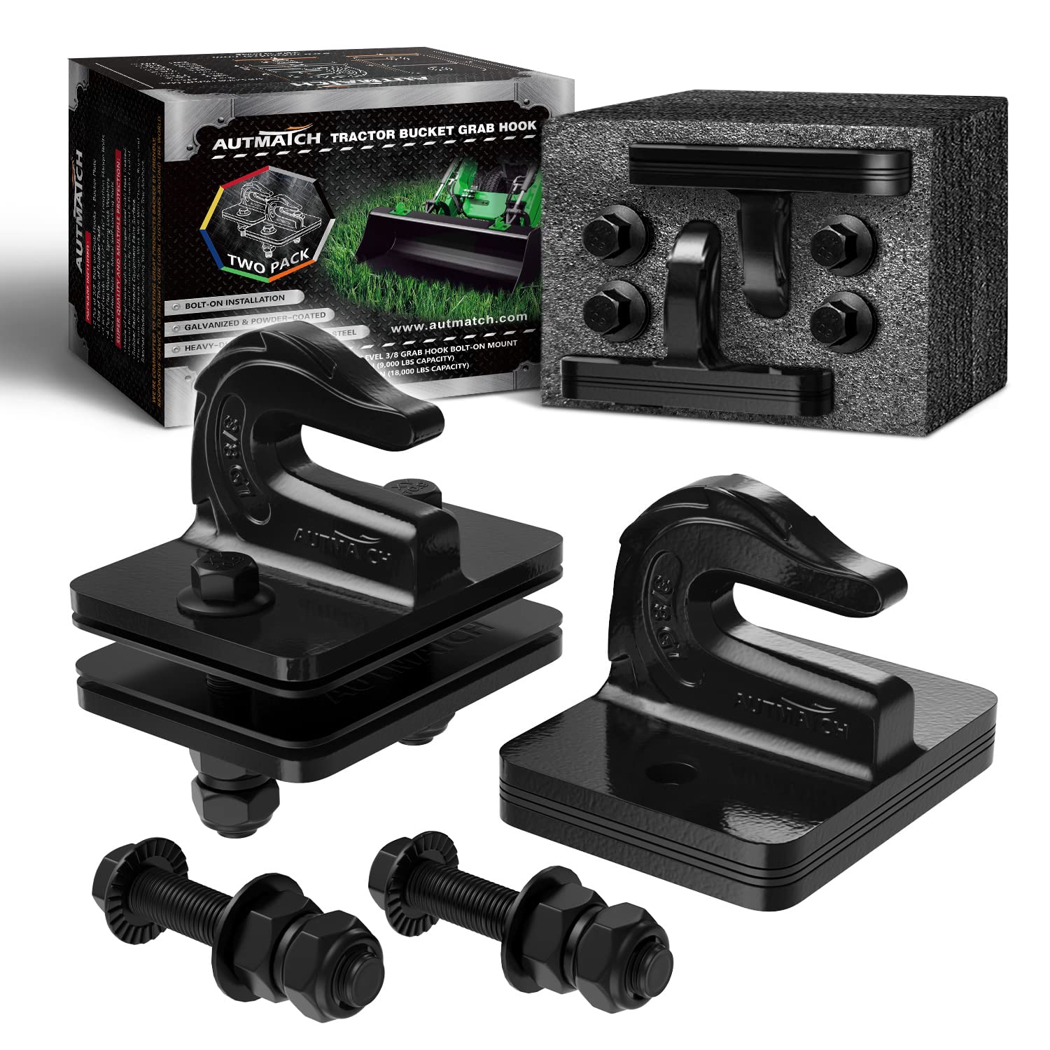 AUTMATCH Tractor Bucket Grab Hook 3/8" (2 Pack) - Grade 70 Forged Steel Bolt On Grab Hook Tow Hook Mount with Backer Plate & Rubber Pads, Max 18,000Lbs Work for Loader, Tractor Bucket, Truck, Black