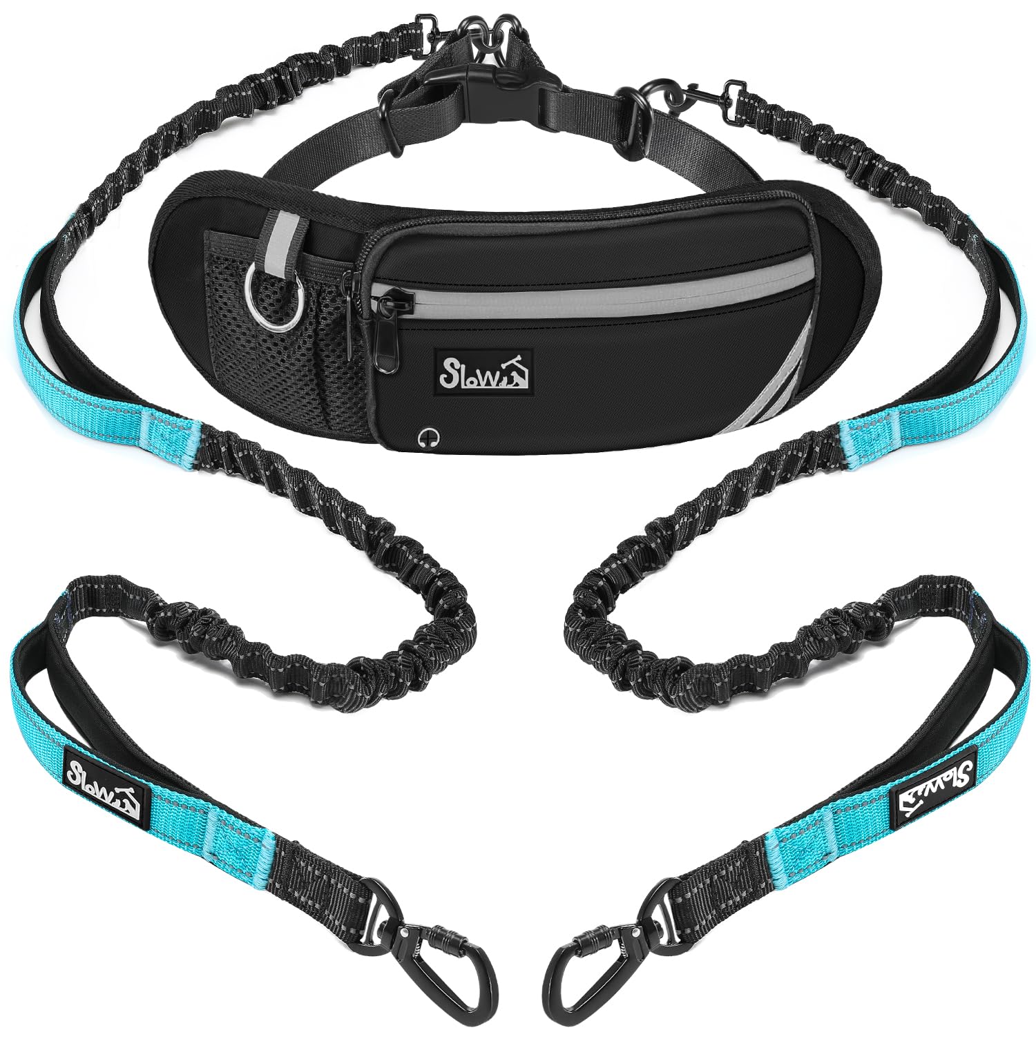 AUTOWT Hands Free Dog Leash for 2 Dogs, Dual Padded Handles and Durable Elastic Bungees with Zipper Pouch, Double Dog Leash with Adjustable Waist Belt for Walking, Jogging and Running(Light Blue, XL)