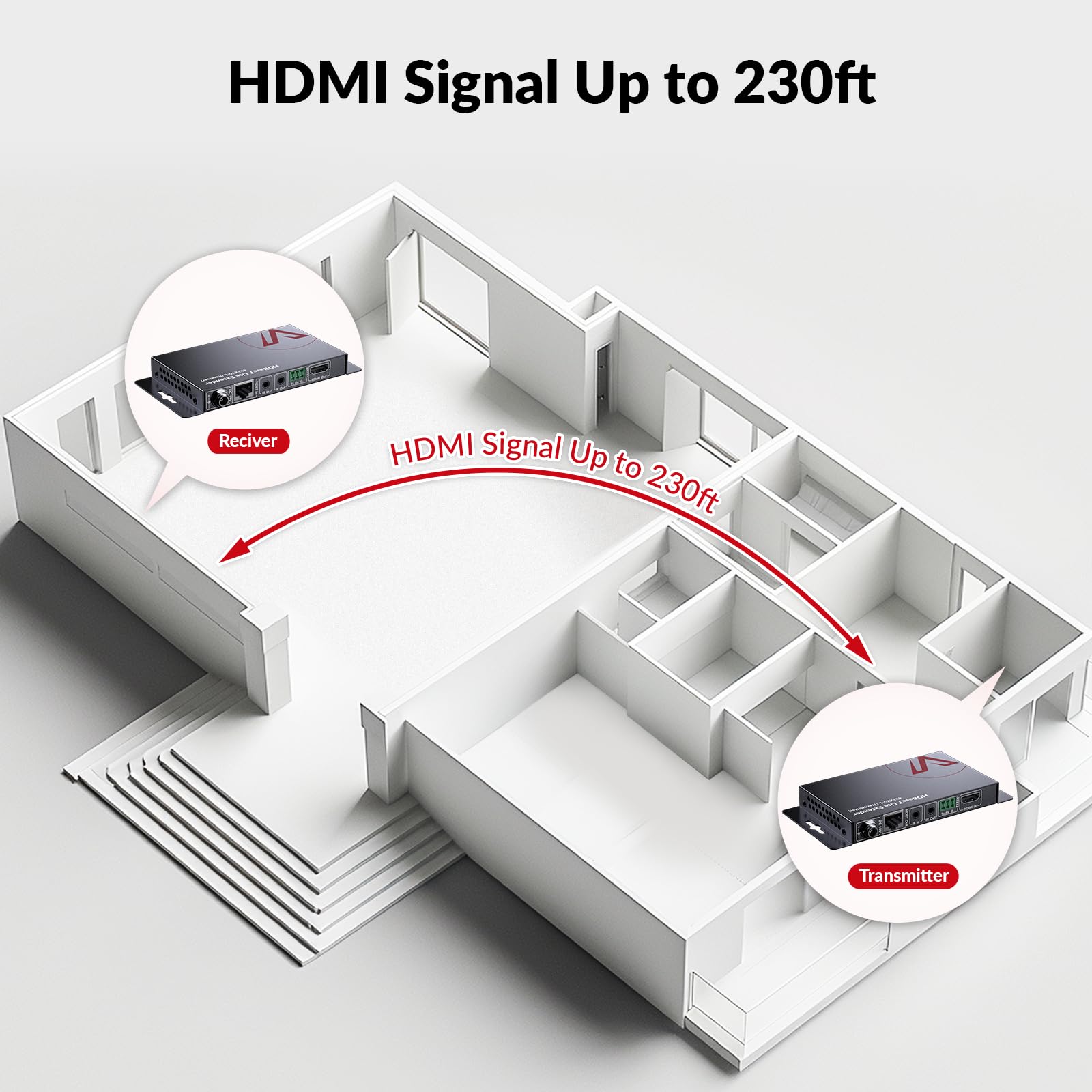 - 【4K@60Hz 4:2:0 8bit HDR】This HDBT HDMI Extender transmits uncompressed 4K@60Hz HDMI signal up to 40m/130ft, and 1080P@60hz up to 70m/230ft over a single Cat 6a/7 cable. Also supports Dolby Atmos, DTS:X, Dolby True-HD, DTS-HD Master, LPCM 2.1/5.1/7.1 CH.
