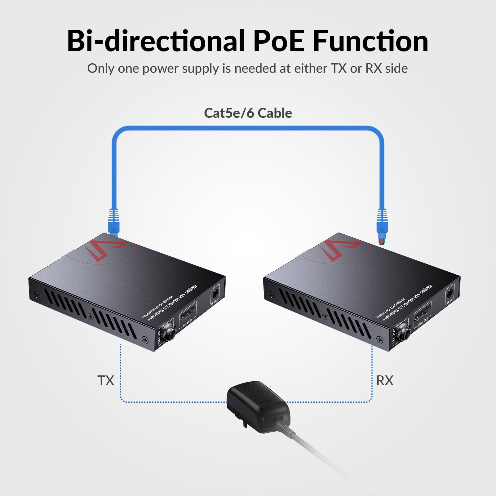 - Professional Configuration: supports standard HDCP 2.2/1.4 and HDMI 2.0 (UTP), high-speed and stable. Supports auto EDID management, automatically choose the most suitable resolution for your devices. It supports one-way PoE, one power adapter to power both units. It supports bi-directional IR control and RS232.