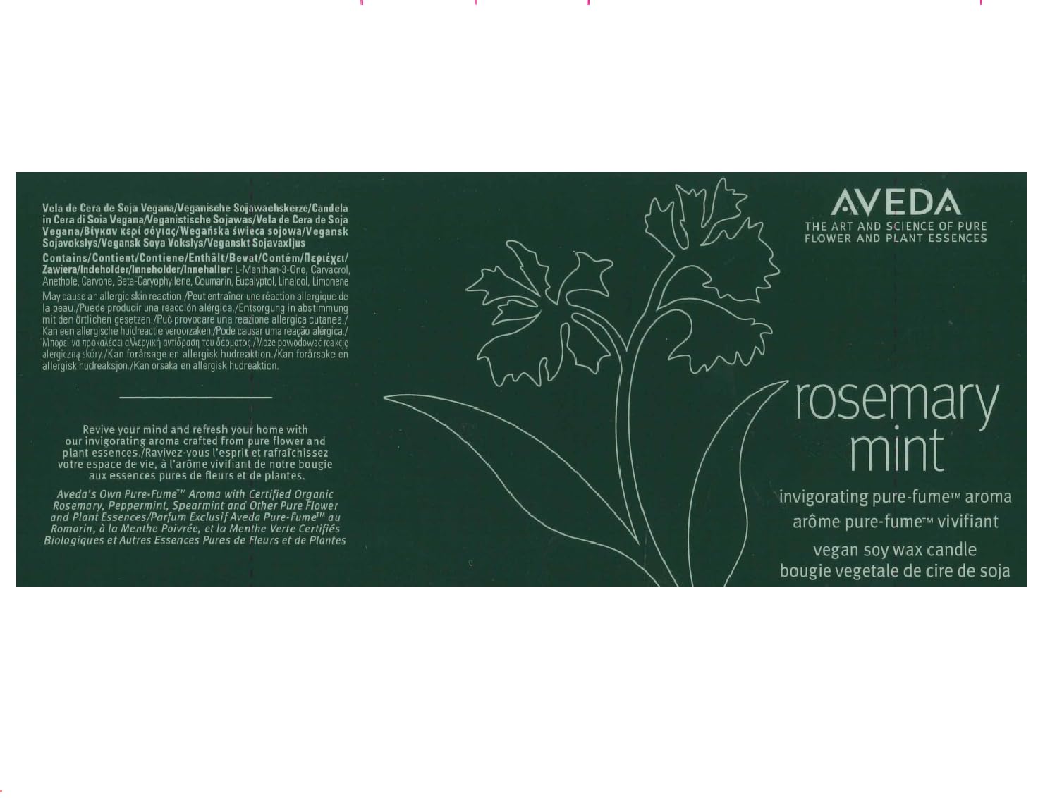 Details: Wake up your senses with the aroma of Aveda Rosemary Mint Vegan Soy Wax Candle. This 100% naturally derived* candle features the beloved Rosemary Mint aroma of certified organic peppermint, spearmint, and rosemary. Because each Aveda soy wax candle is individually hand poured by our artisans, you will notice that yours has its own unique character, unlike machine-made candles. Enjoy the natural aroma and artistry of your one-of-a-kind candle! If you love the Rosemary Mint aroma, try the Purifying Shampoo and Weightless Conditioner and the body care line, which includes Body Lotion, Hand & Body Wash, and Composition Oil. Simply light to create an atmosphere of calm and peace. Do not burn longer than 1 1/2 hours or unattended. Allow to solidify before relighting. Should black smoke appear, trim the wick. It should be clean and not longer than 1/4" (6mm). Do not burn down to the bottom, or on or near anything that can catch fire. Keep out of the reach of children and pets. *Per the ISO 16128 Standard, from plants, non-petroleum minerals, and/or water.