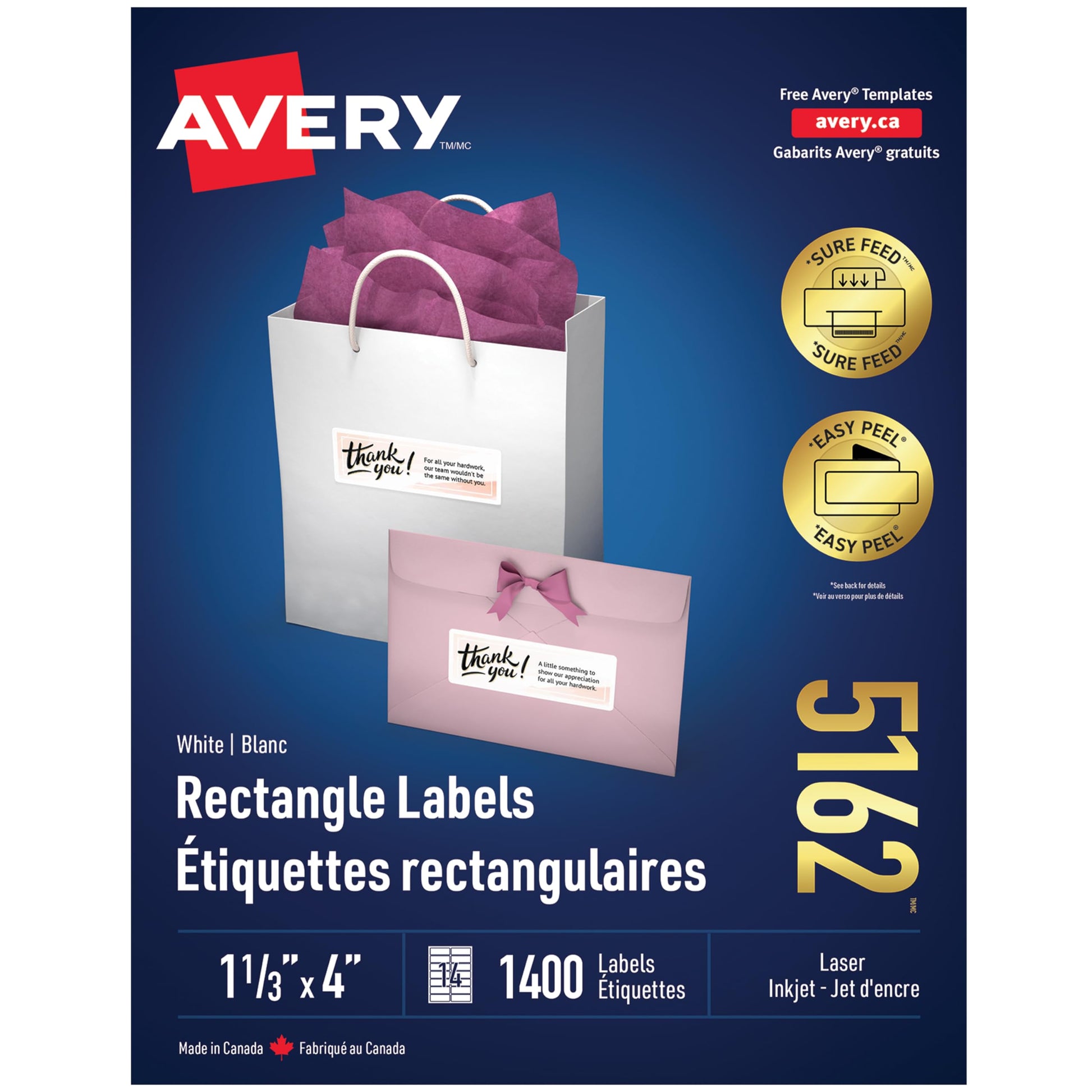 Avery Address Mailing Labels with Easy Peel for Laser/Inkjet Printers, 1-1/3" x 4", White, Rectangle, 1400 Labels, Permanent (5162) Made in Canada
