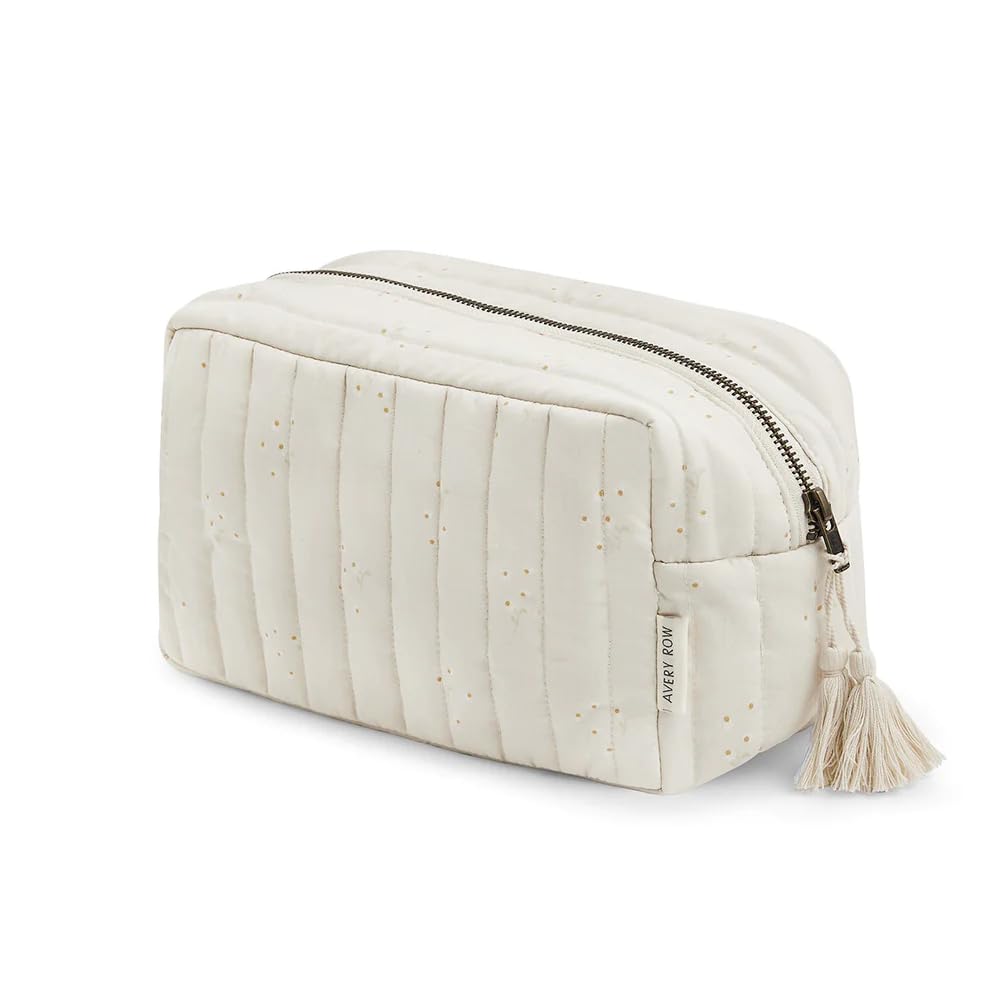 Our organic quilted wash bag comes in our unique prints with a stylish tassel. A beautifully designed, practical pouch for parent or baby to store your toiletries, make up or nappies and creams. It also has a handy elasticised pocket inside. The product that is for parent and baby and has an infinite number of uses.