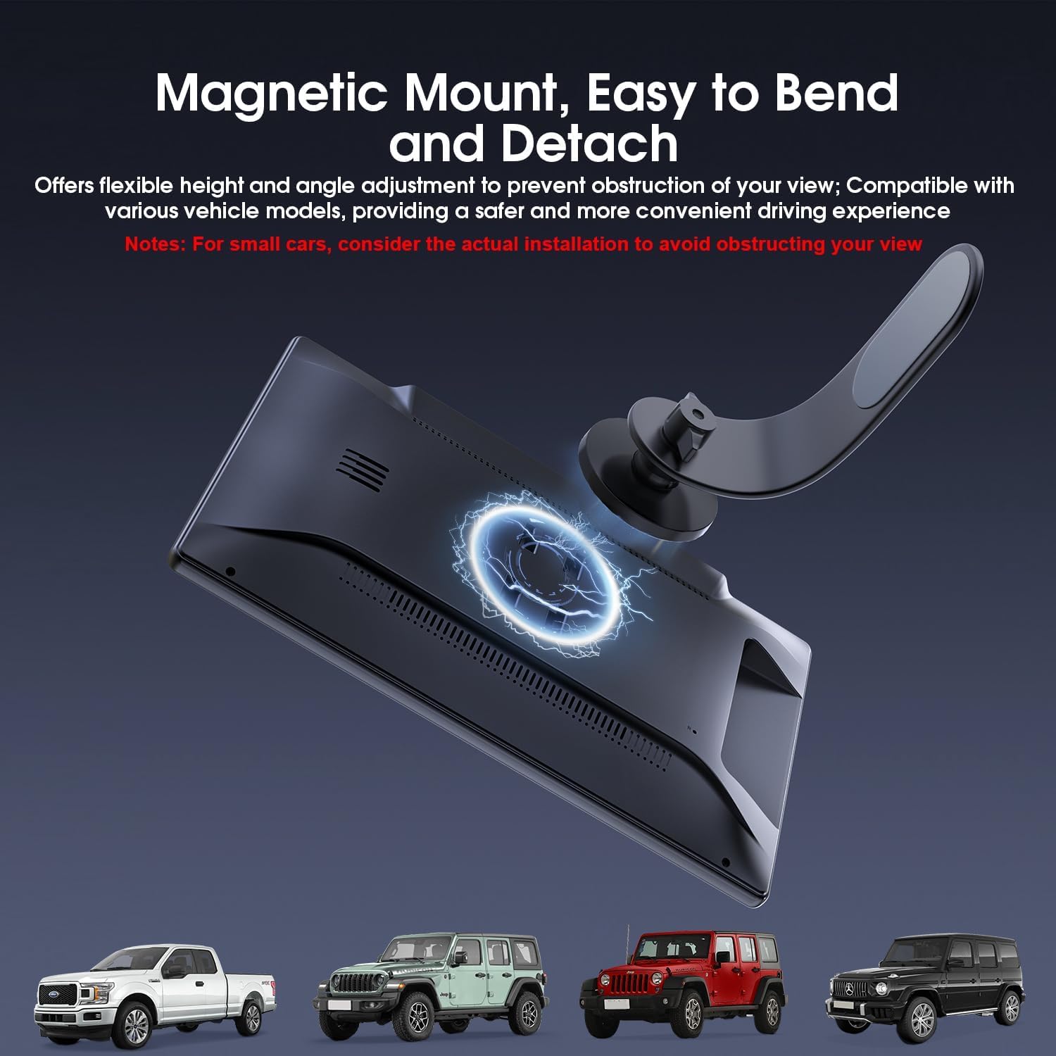 - Stable Installation with Magnetic+Suction Cup Mounts: Installation is quick and easy with magnetic and suction cup mounts. The innovative magnetic mount supports 360-degree rotation and 180-degree tilt, allowing angle adjustments for the best view. It stays stable in SUVs, trucks, Jeeps, or RVs, even on rough off-road terrain, ensuring your car play setup remains secure