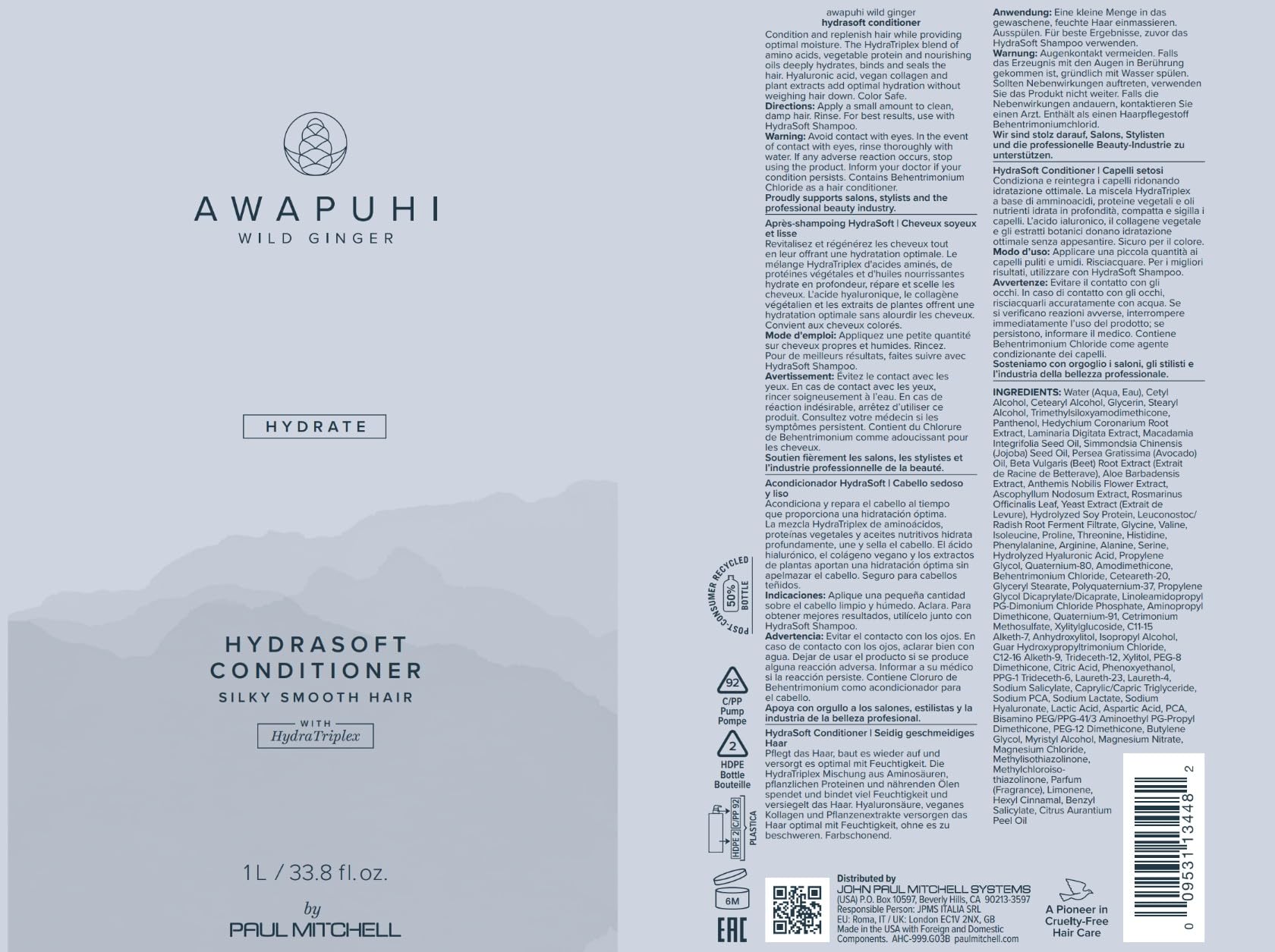 Awapuhi Wild Ginger by Paul Mitchell HydraSoft Conditioner, For Silky Smooth Hair, Ideal For All Hair Types, Especially Dry + Frizzy Hair, 1 L.