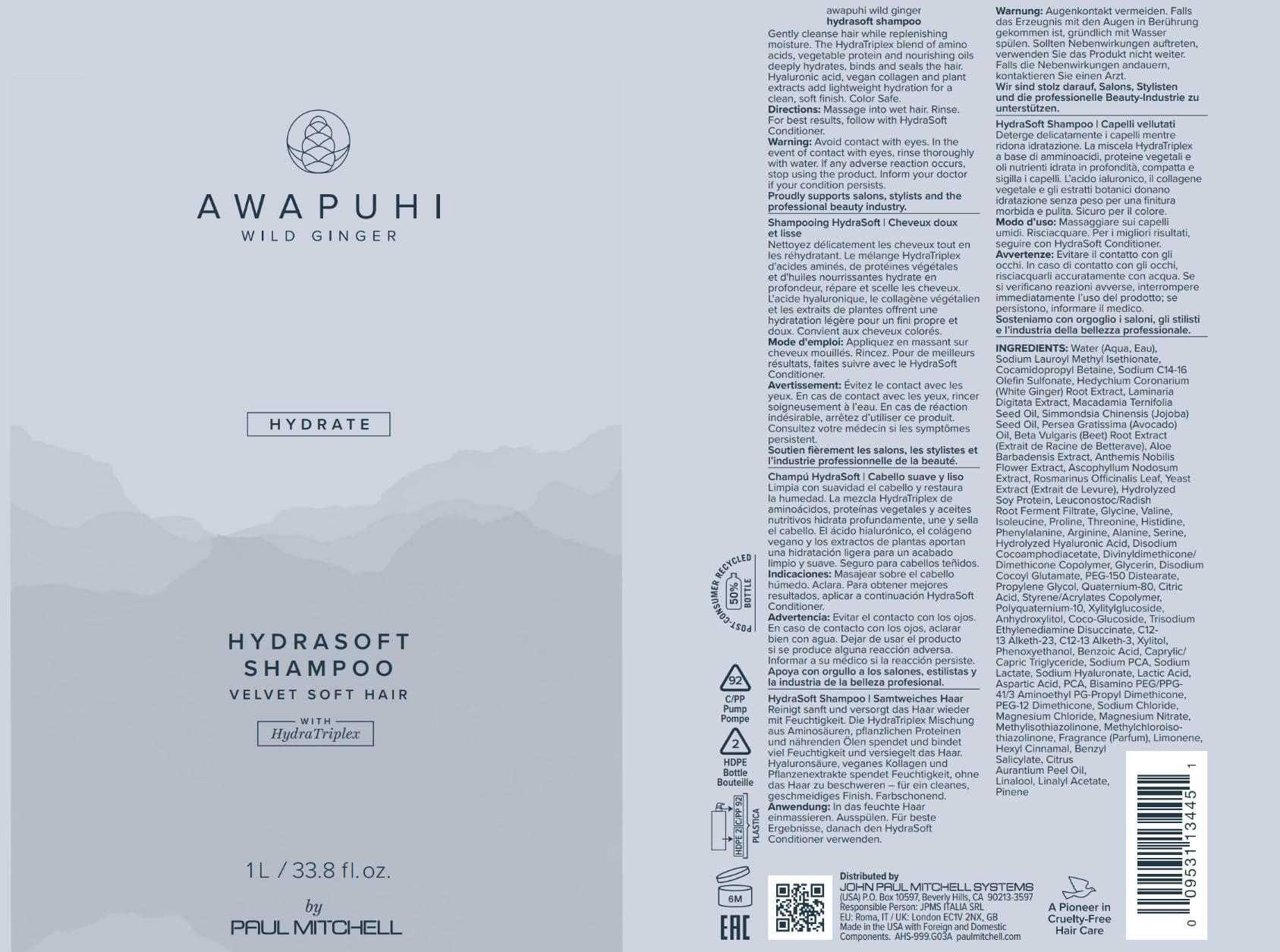 Awapuhi Wild Ginger by Paul Mitchell HydraSoft Shampoo, For Velvety Soft Hair, Ideal For All Hair Types, Especially Dry + Frizzy Hair, 1 L