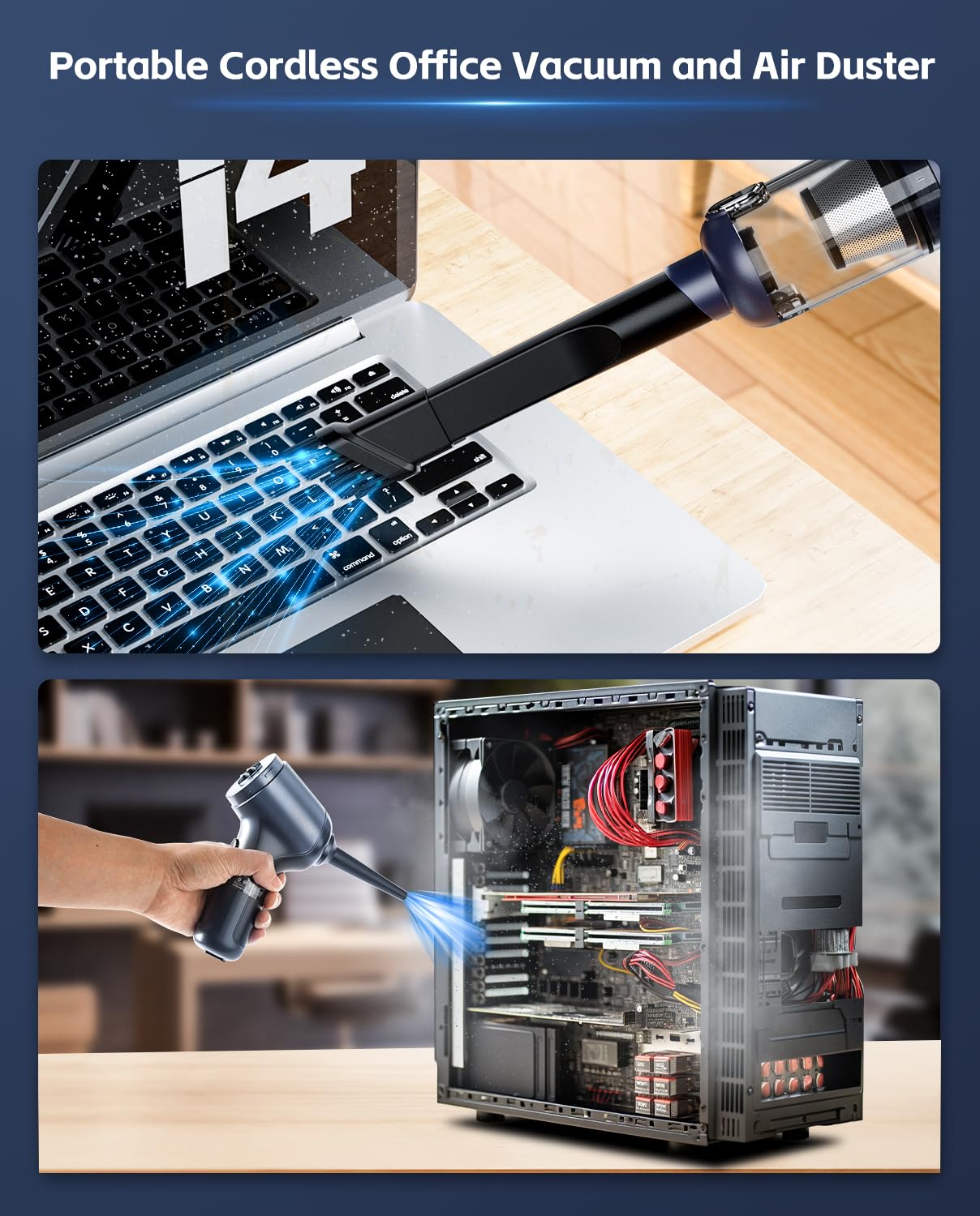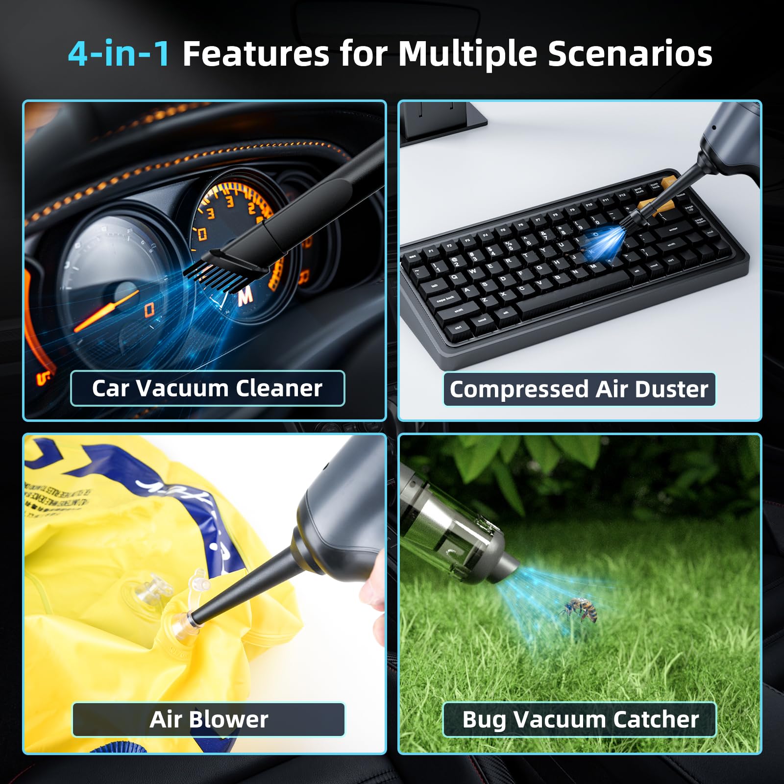- 【4-in-1 Handheld Vacuum】This car vacuum cleaner includes multiple attachments for vacuuming, blowing and inflating tasks. Ideal for cleaning desks, car interiors, and pet hair, it also works as a dust buster for keyboards and more. Perfect for daily cleaning and outdoor trips, it's your ultimate cleaning companion.