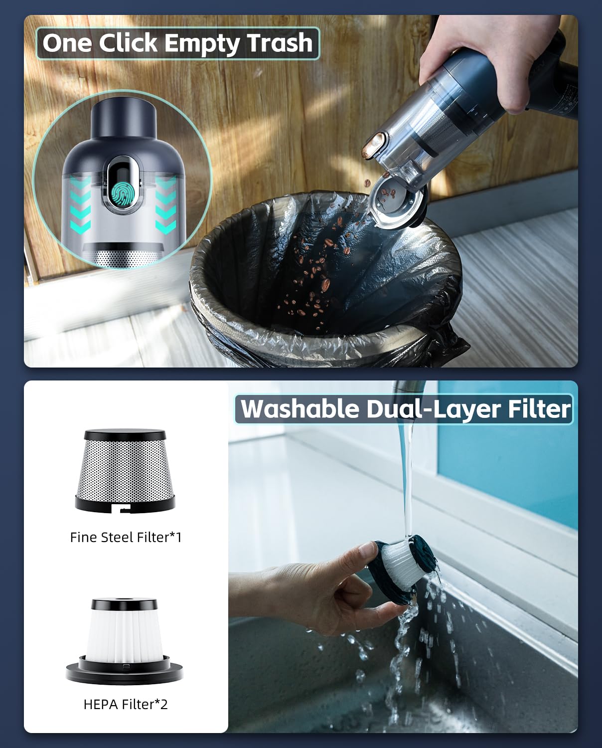 - 【One-Click to Dust & Easy Cleaning】The vacuum features a one-click emptying mechanism, allowing you to effortlessly and quickly dispose of the dust with at the press of a button. The transparent design allows you to see when it’s time to empty the dustbin. The built-in flip cover on the nozzle prevents dust from spilling out when not in use.