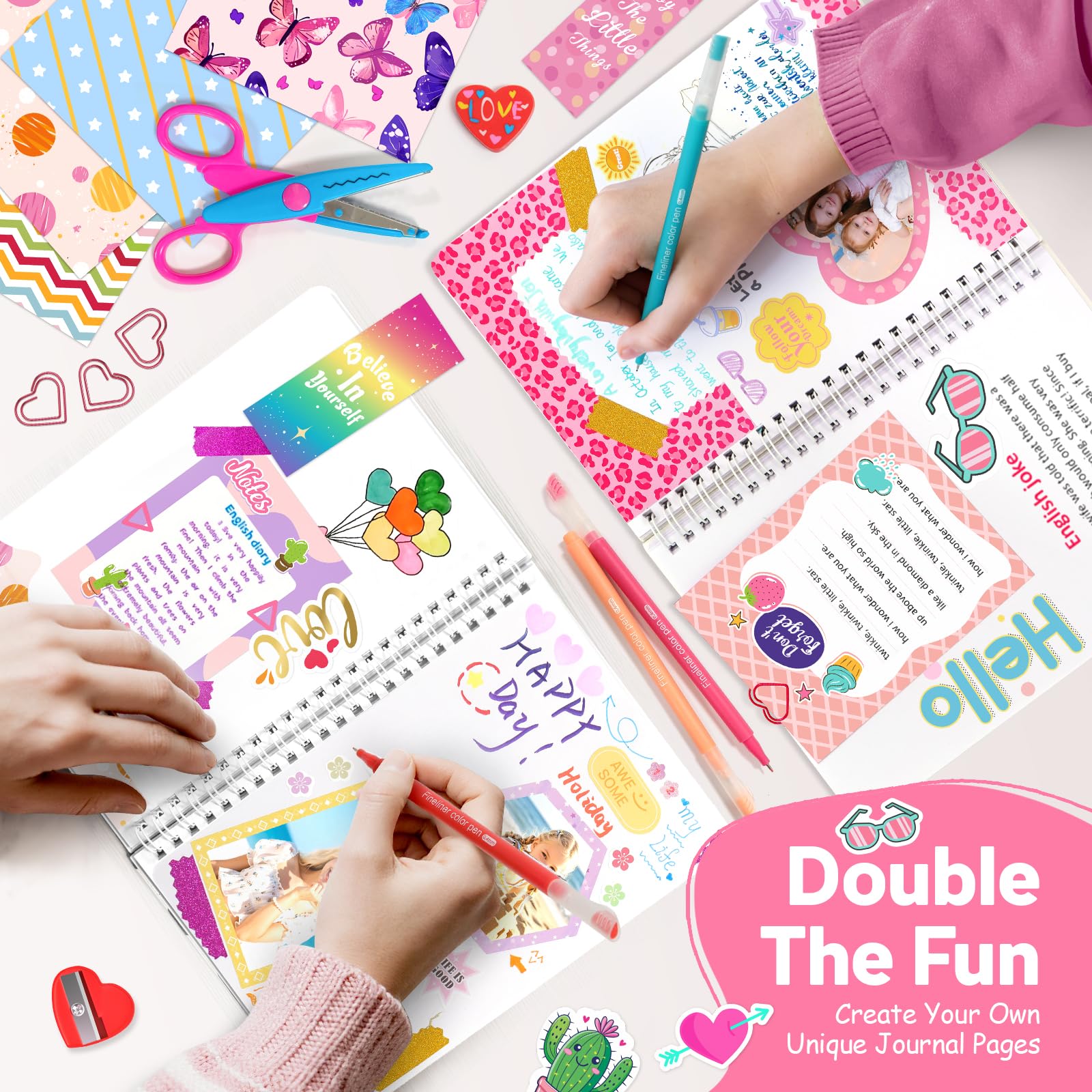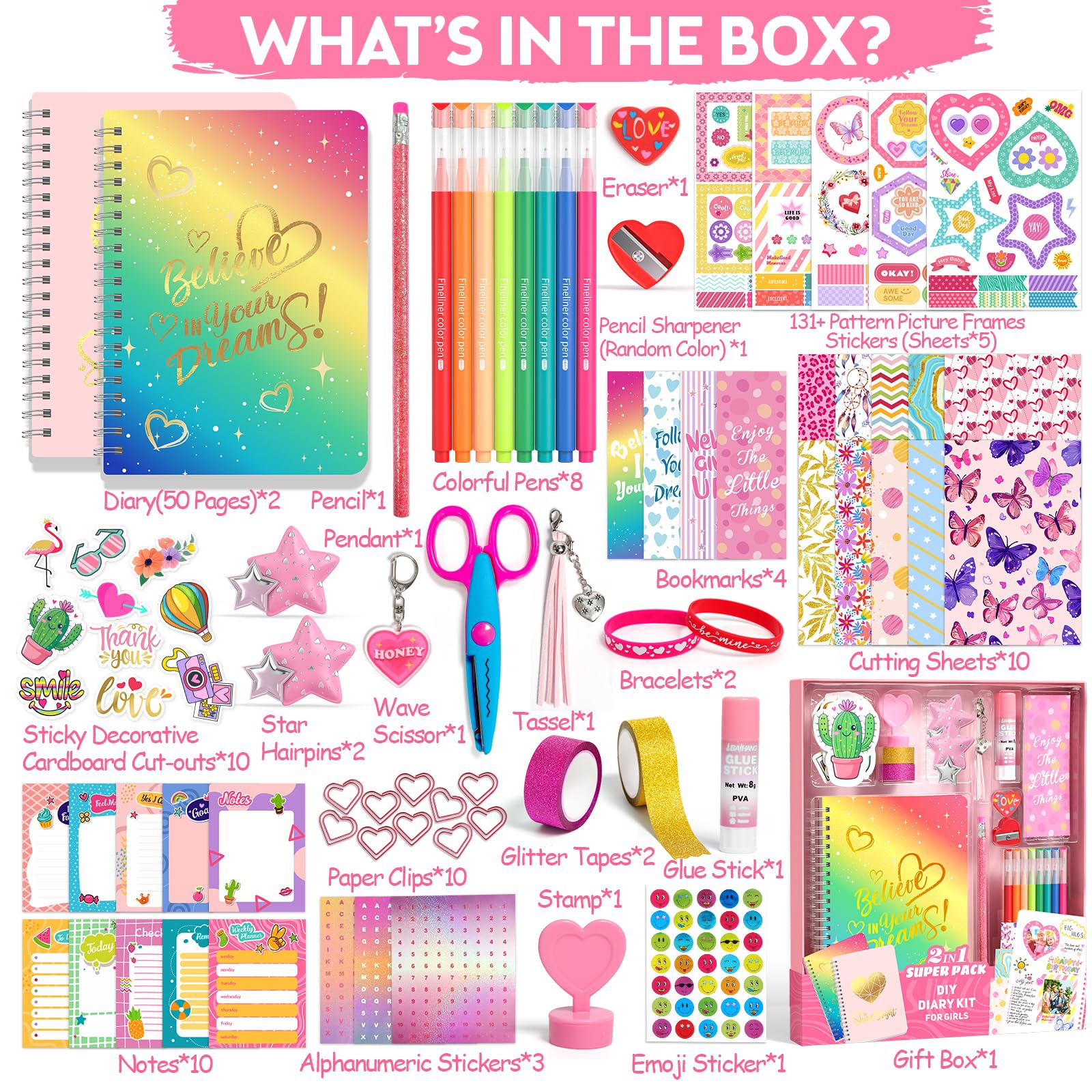 - 【2-IN-1 SUPER PACK JOURNAL SET】This 204+ girl’s journal set including everything you need. Includes: 2 diary(50 pages each), 4 bookmarks, 131+ pattern photo frame stickers(sheets*5), 10 scrapbook art sheets, 10 notes, 10 cardboard cut-outs, 3 alphabet stickers, 8 colored pens, 10 paper clips, 2 glitter tapes, 2 pendant, 2 hair clips, 2 wrist band, stamp, emoji sticker, pencil, sharpener, eraser, wave scissor, glue stick and gift storage box.