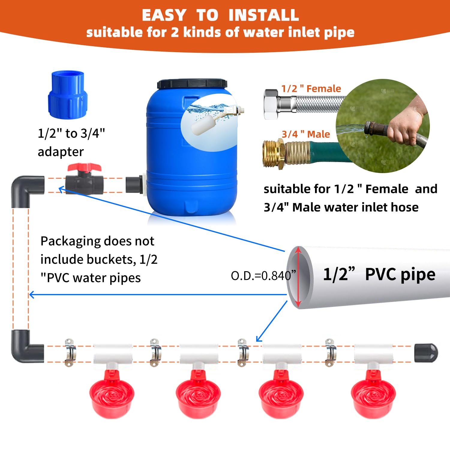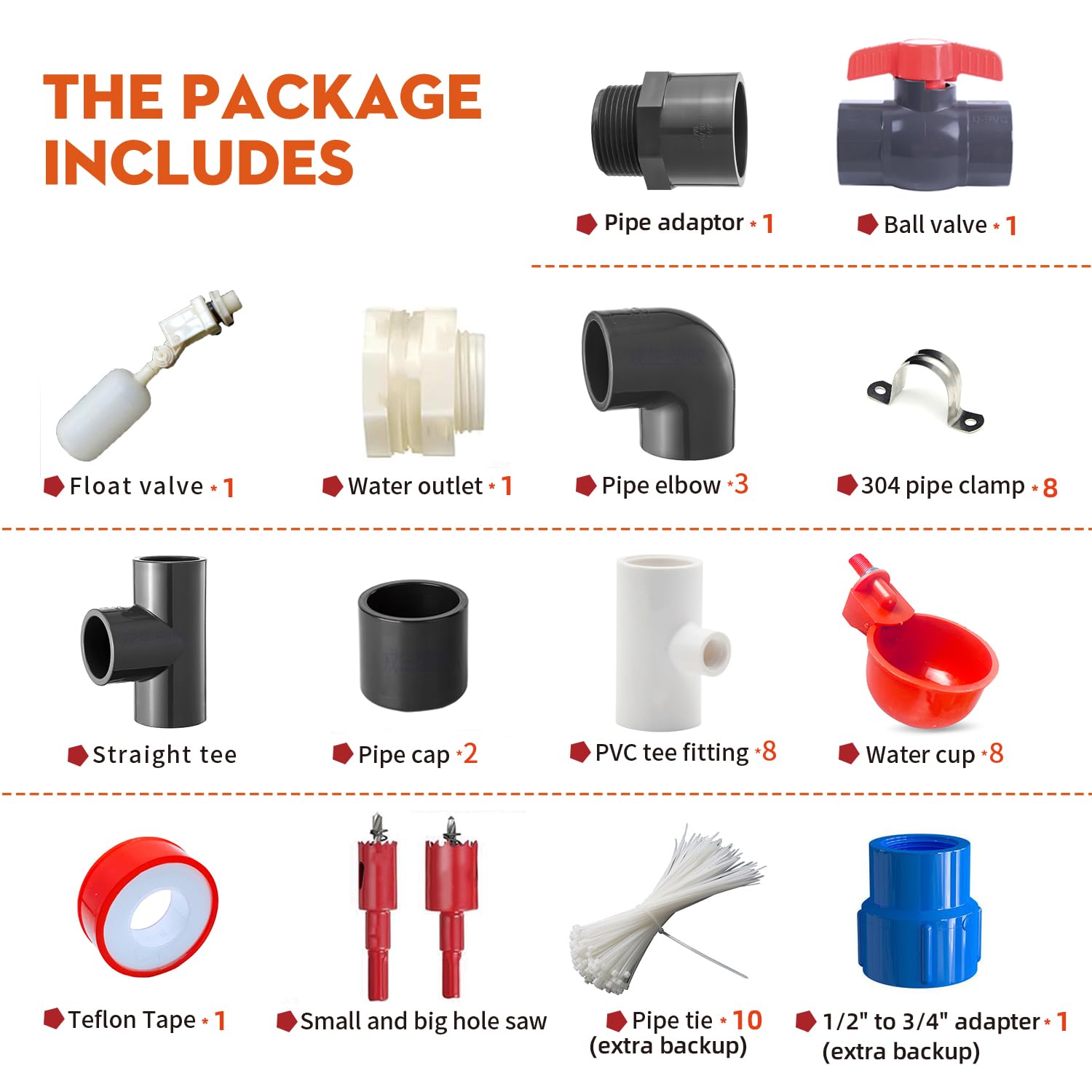 - đăMeet Different Chicken Coopăthe kit includes 8 automatic drinking cups, 8 cups special tee, 1 buoyancy water valve, 1 ball valve, 1 inlet adapter, 8 pipe clips, 3 pipe elbows, 2 pipe plugs, 1 tee, 2 matching bucket opening saws, etc. It can be installed in a variety of forms to meet the needs of different chicken coop DIY. All you need is a 1/2 "PVC pipe and an bucket to make this poultry waterer.