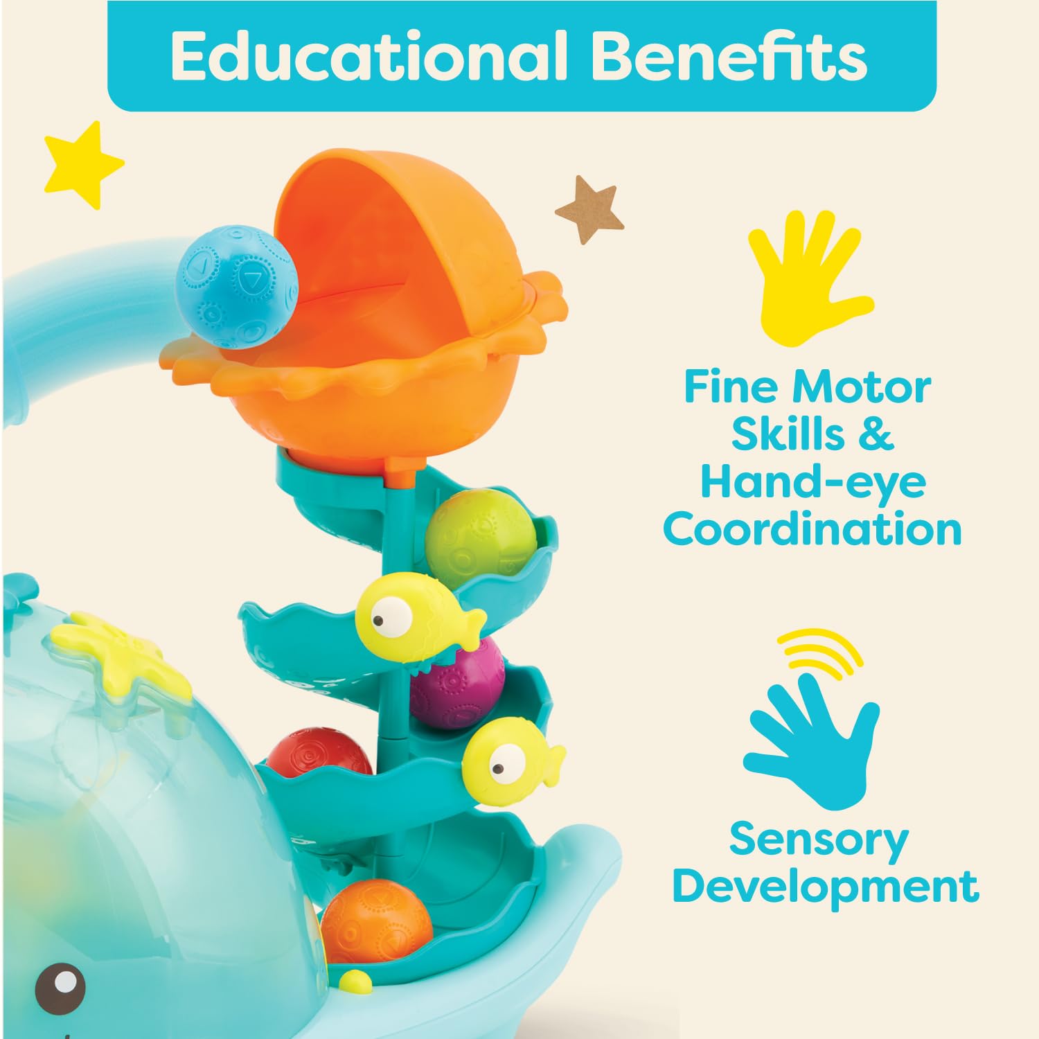 - 2 Ways to Play: Press on the starfish to see the balls pop out and go down the spiral or rotate the spout to pop 'em in a different direction.