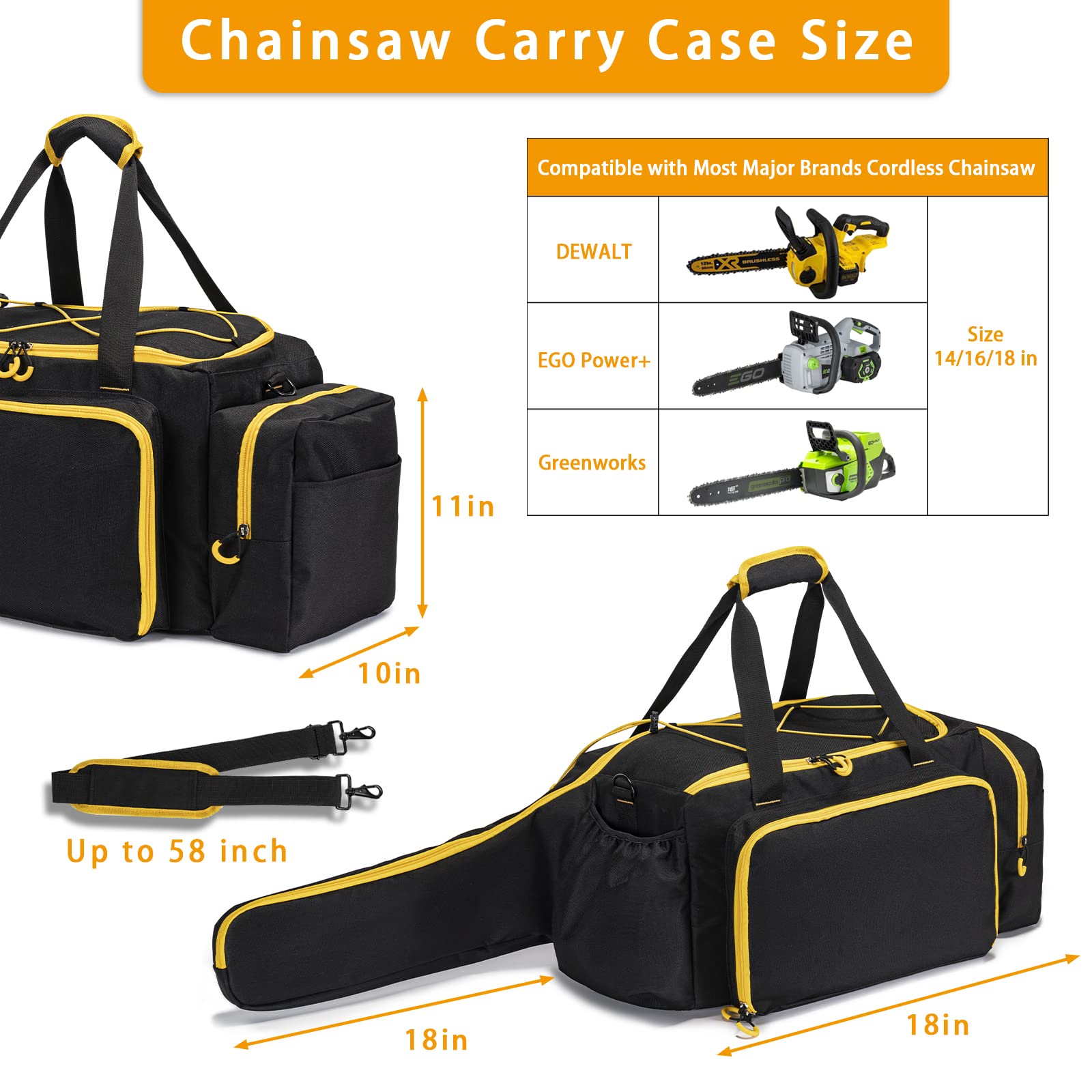 - Large Capacity: This chainsaw case come with space for chainsaw&accessories, it has plenty of pockets for bar oil, extra chains, 2 battery, tools, top storage rope great for gloves, towels, ensure all your tools remain together. This chain saw case features multiple storage pockets for items like chainsaw gloves and comes with a 14’’ to 18’’ bar scabbard