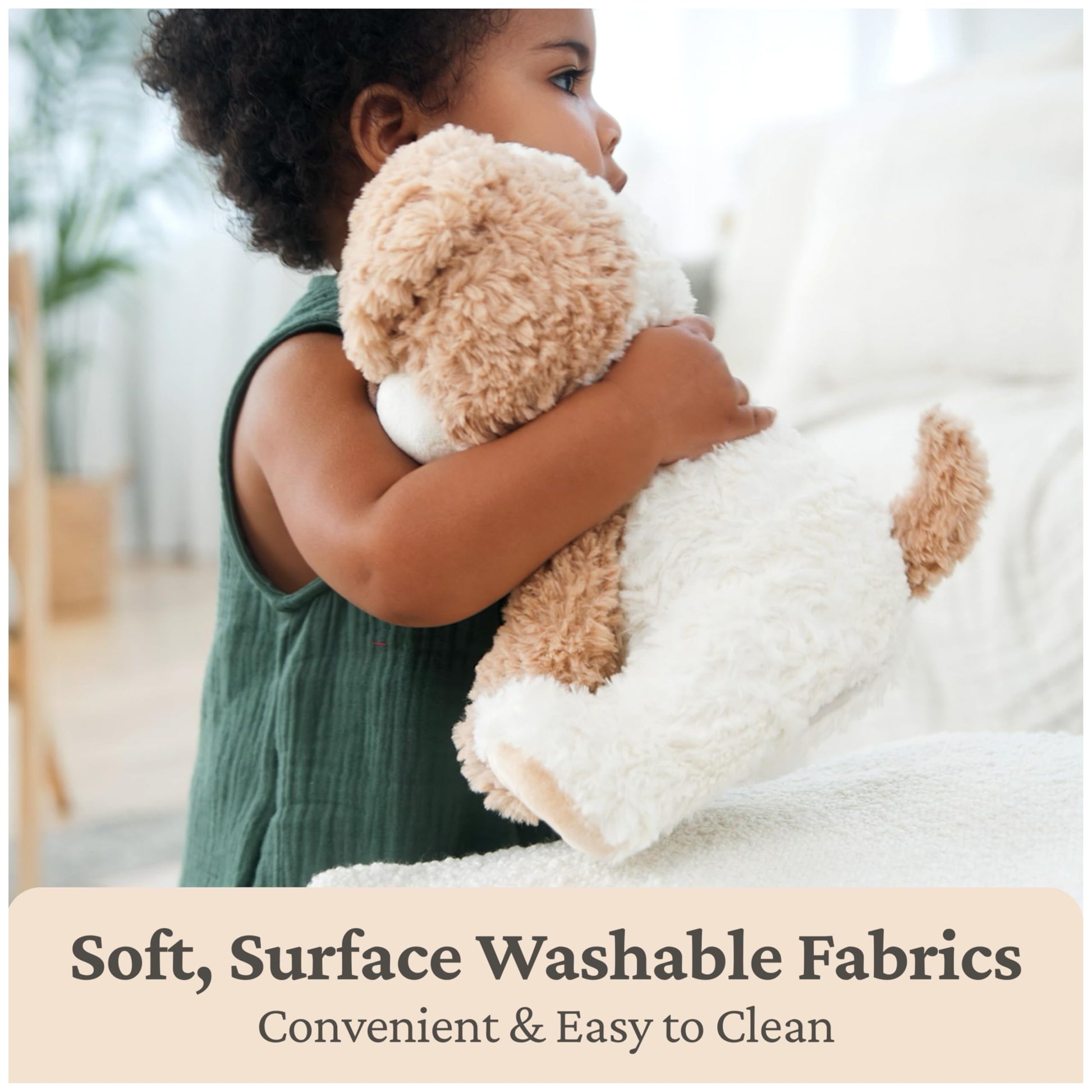 Details: GUND Baby is proud to introduce Peeki, the peek-a-boo puppy! This innovative, oh-so-cute spotted puppy is the latest addition to the GUND Baby animated plush collection, turning playdates into fun, tactile, snuggly exploration sessions. As soon as Peeki’s switch is turned on, it comes to life and greets Baby in a cute child’s voice, asking if they want to play peek-a-boo. Then parents and siblings can press one of Peeki’s paw pads to activate an engaging game or song to entertain baby. Press Peeki’s right paw to begin a fun, silly game of peek-a-boo! Peeki uses its short, floppy ears to cover its eyes and hide, occasionally taking a peek at baby with just one ear. Then, for a fun surprise, press Peeki’s left paw pad - Peeki sings a unique peek-a-boo song! This cuddly puppy was also made for snuggle sessions and boasts a fluffy coat of cream and sandy-tan plush with a soft muzzle, chocolate-brown nose, and matching embroidered eyes. Peeki’s sweet expression and voice will have your little ones giggling and ready to play! Appropriate for ages 6 months and up. Each stuffed puppy requires 3 AA batteries (included). Surface washable; ships in a protective poly bag.