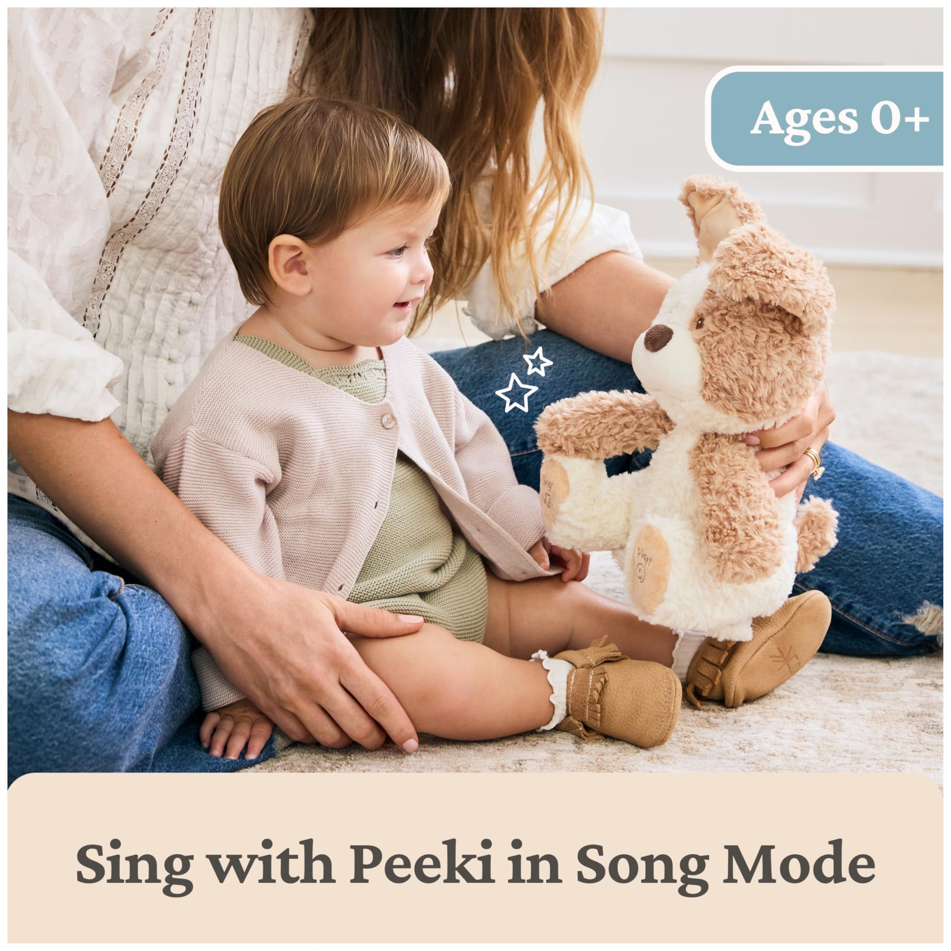 - SINGING PUPPY: Peeki is a cute seated puppy that uses music and movement to stimulate baby’s senses and encourage tactile play. This 12” stuffed animal has soft plush, embroidered details, and makes interactive play fun as it “talks” to little ones