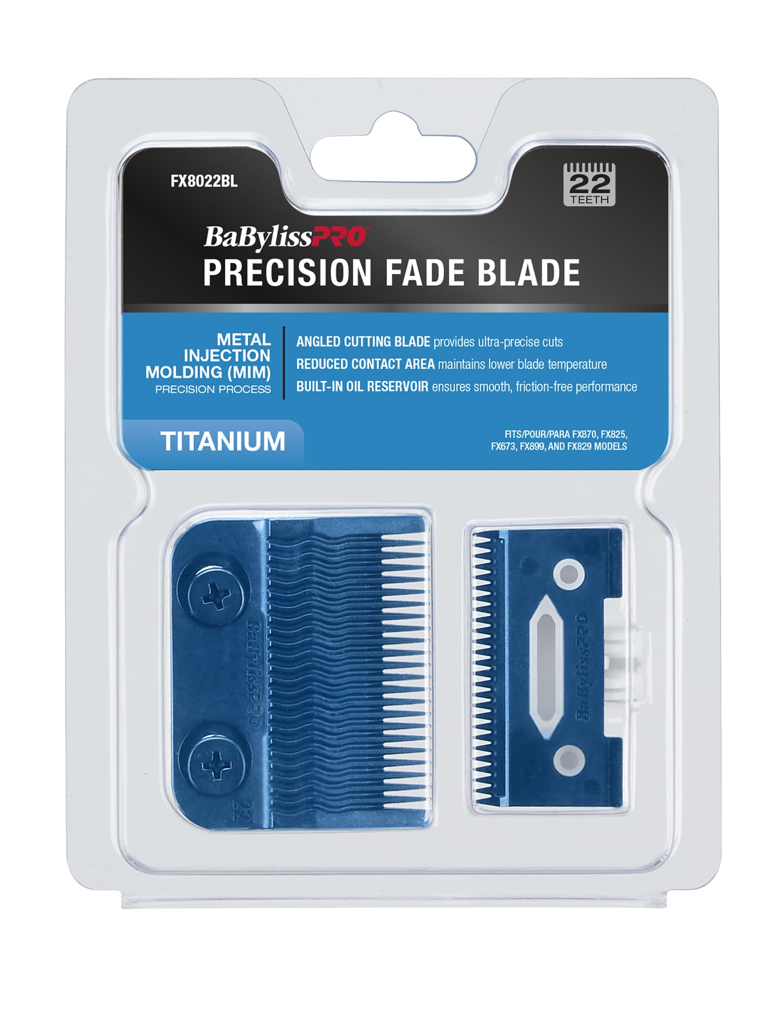 Details: This blue titanium precision fade blade is a metal injection molding (MIM) precison process replacement blade for any FX899,FX870, FX829, FX825, and FX673. The blade is angled with 22 teeth resulting in precise cuts.