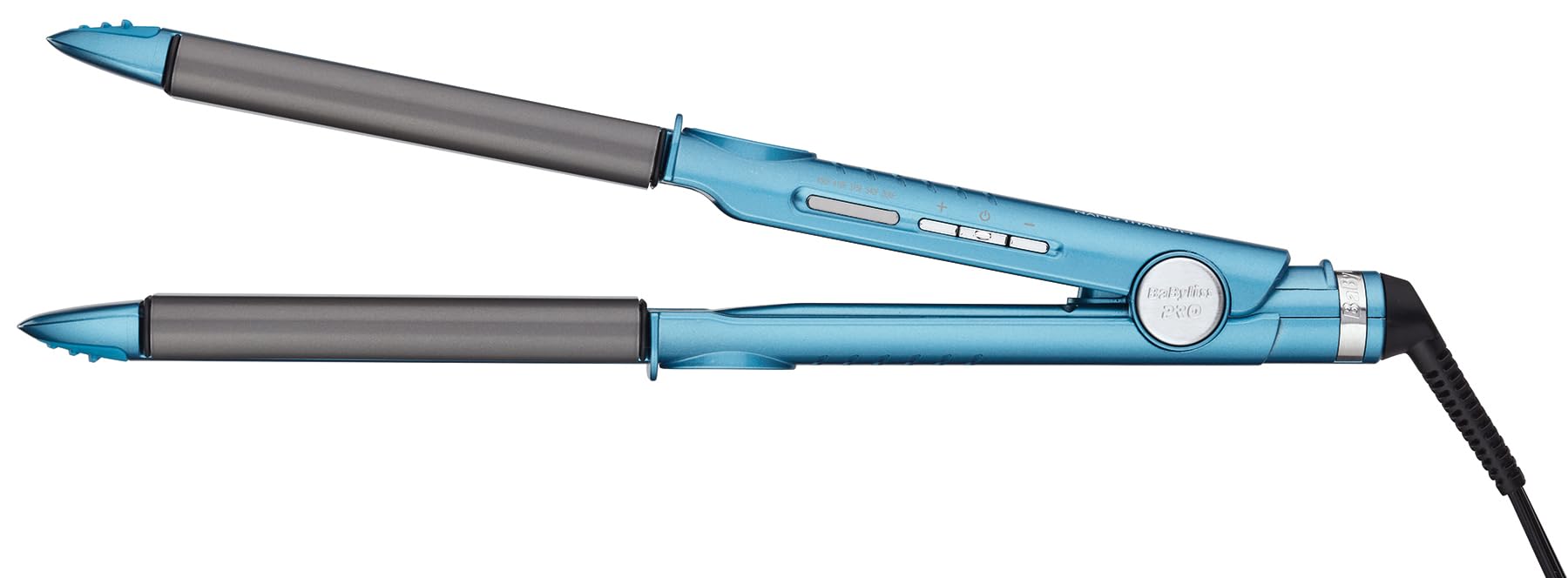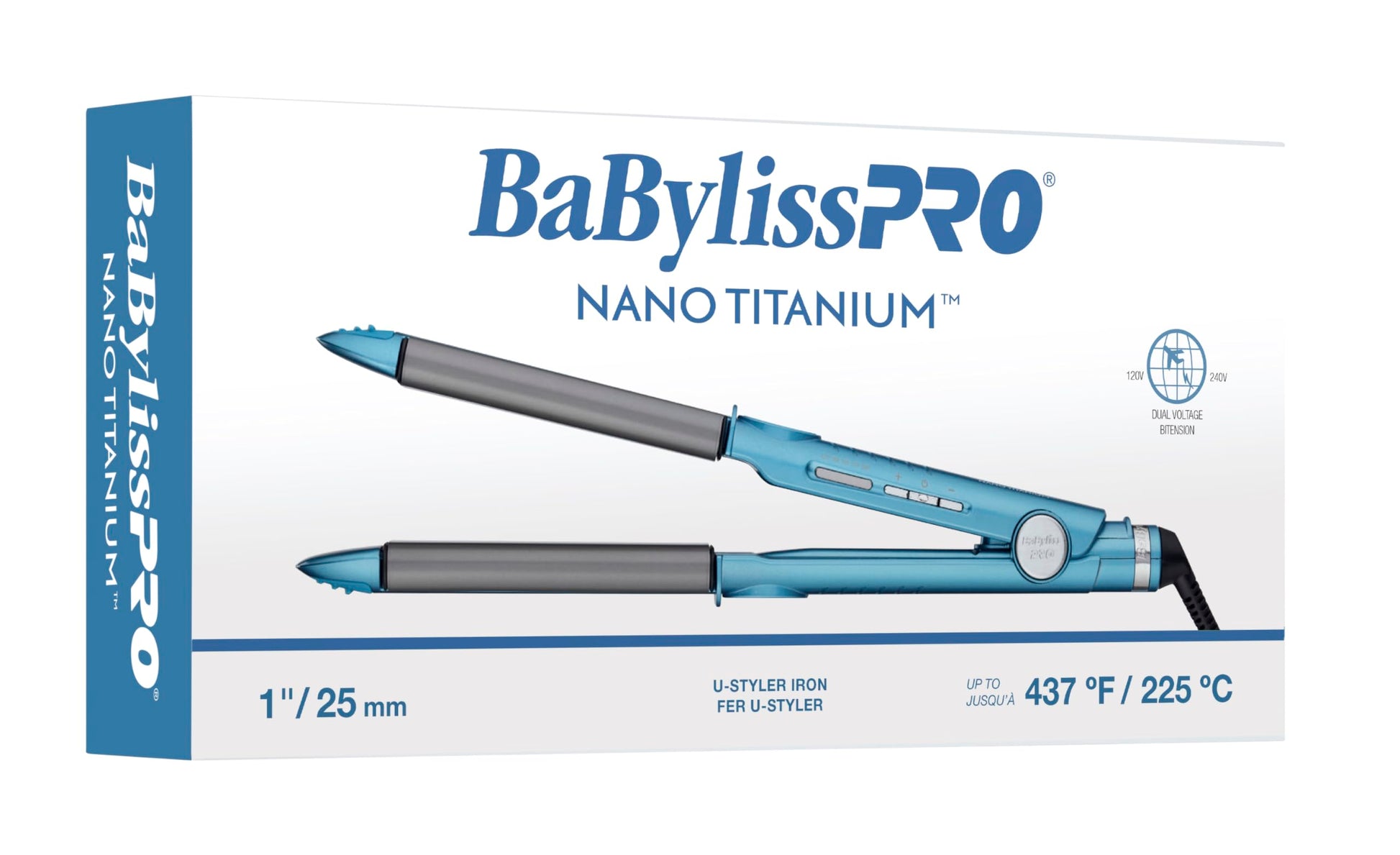 BaBylissPRO Nano Titanium and Ceramic U Style Dual Voltage Flat Iron with Unique Curved Side Plates for flips, waves and curls