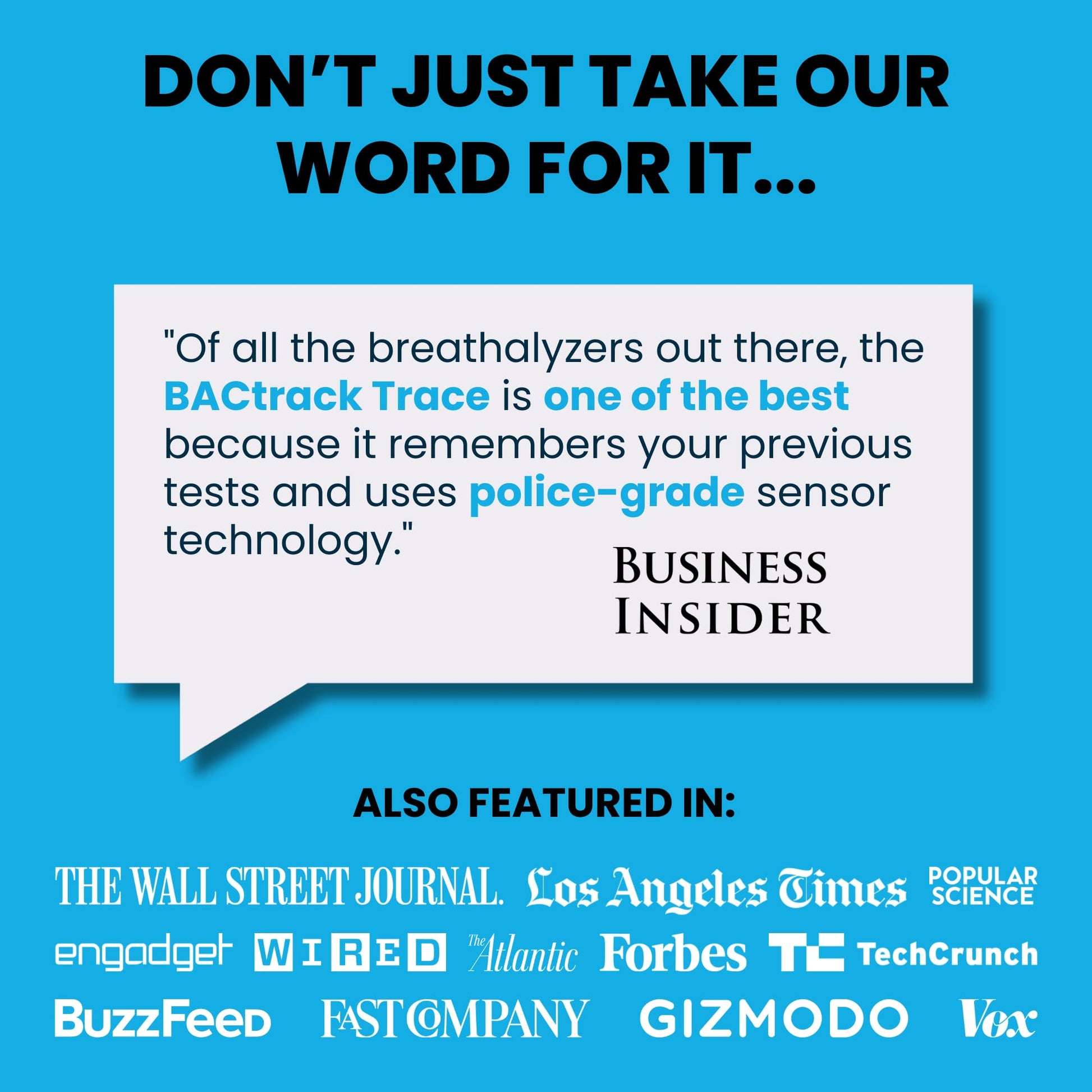 Details: Powered by BACtrack's state-of-the-art Xtend Platinum Fuel Cell Sensor technology, the BACtrack Trace Professional Breathalyzer delivers reliable and accurate BAC results, with police-grade accuracy. From being used as an alcohol detector for employees in businesses to acting as an alcohol tester for patients in clinics or treatment centers, the Trace is perfect for a variety of professional alcohol sensing, detecting and testing applications. And because of its small size and portable design, it's also works great as a personal BAC breathalyzer. Help friends and family make better decisions while drinking with the accurate and affordable BACtrack Trace alcohol breathalyzer.