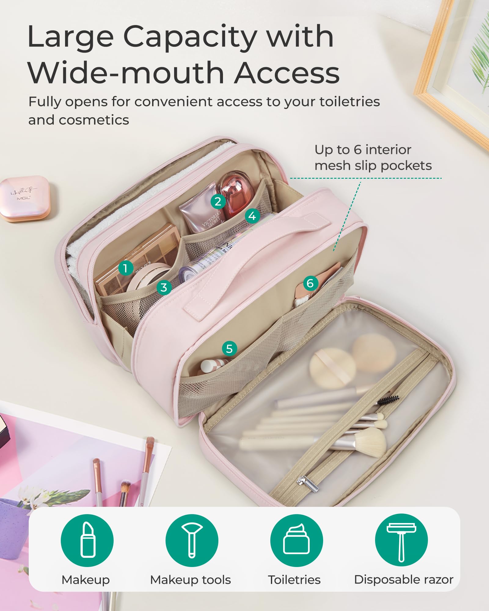 BAGSMART Toiletry Bag for Women, Wide-open Makeup Bag Organizer for Travel Essentials Travel-size, Water-resistant Large Capacity Cosmetic Bag for Accessories, Shampoo, Toiletries with Handle, Pink