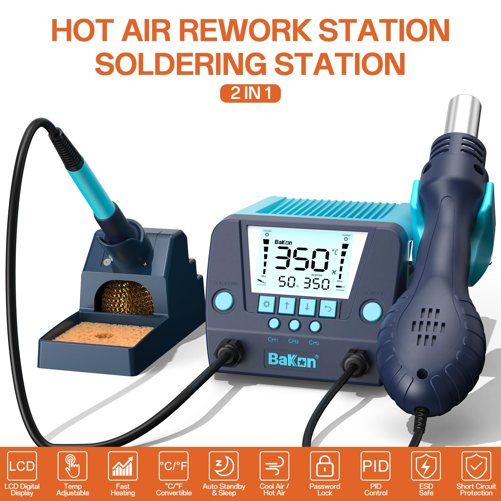 BAKON 882 2-in-1 SMD Hot Air Rework & Soldering Station with LCD, Auto Sleep, °F/°C, Tips ,Nozzles, Solder Wire, Tweezers, Solder Sucker