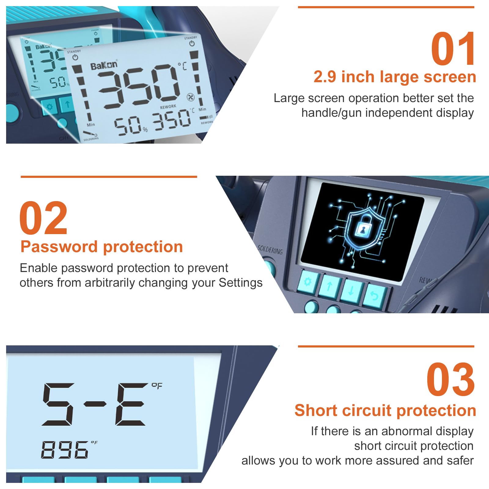- 【Multifunction】This machine has a visual design with a large 2.9-inch LCD screen.The soldering station kit has many practical functions,such as automatic standby and automatic sleep,digital temperature calibration and compensation,°C-°F conversion,temperature preset storage (3 preset memory buttons), password lock, ESD safety, cool air/hot air changeable,short circuit protection, etc.Good tools are prerequisite to the successful execution of a job