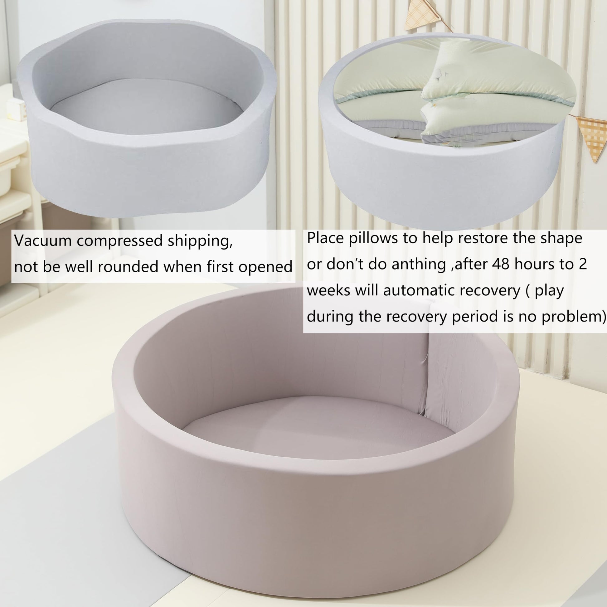 - 【No Installation Required】 The indoor play ball pool is packed in vacuum bags . Once opened, it will expand immediately without installation, but it will not immediately to a perfect round. You can fill the ball pit with pillows, blankets ,etc. to help it recover faster, or you can use it directly. The memory foam will recover after 48 hours,within two weeks it will fully expand to its orginal shape!