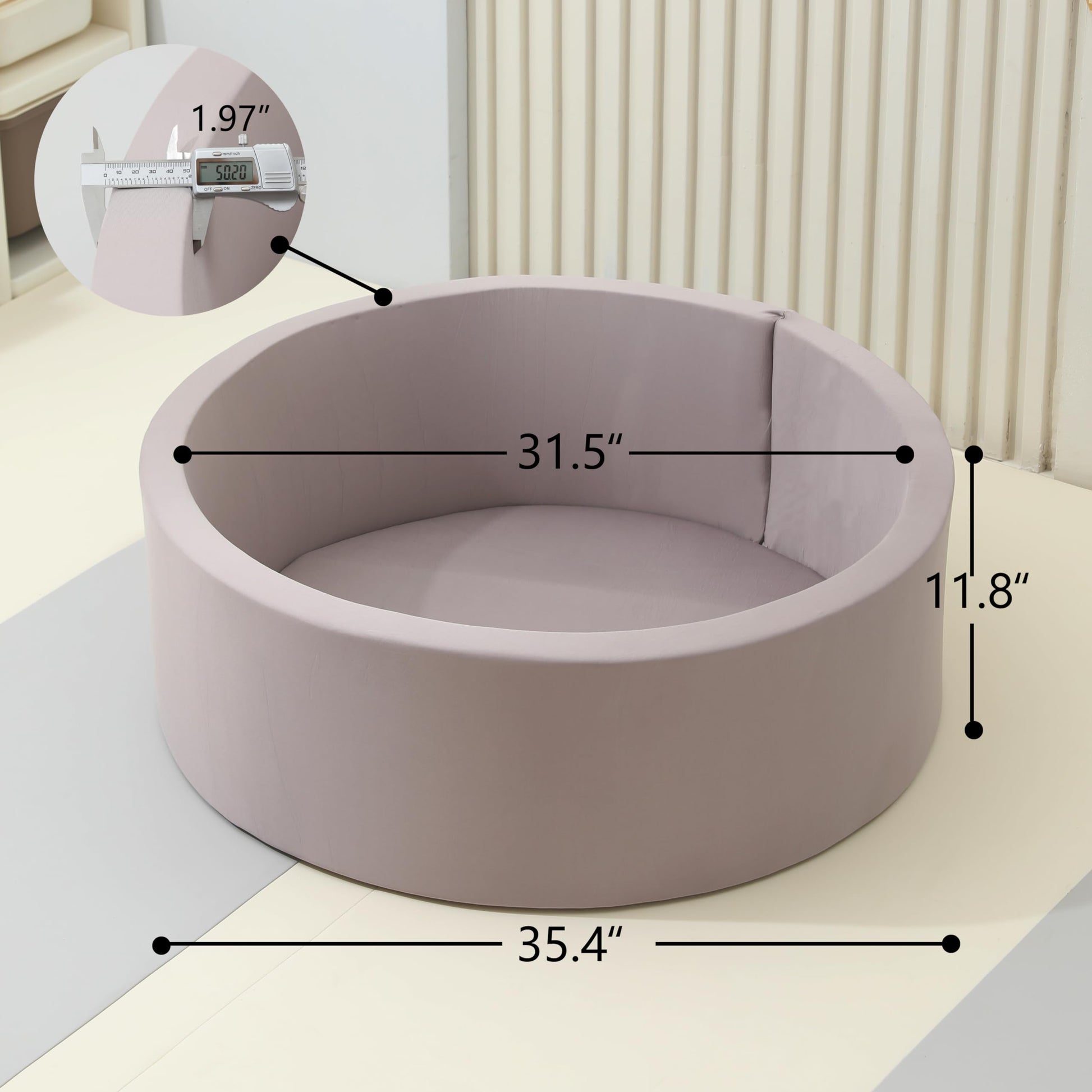- 【Size of Ball Pit】 Outer diameter: 35.4", height: 11.8", ball pool edge thickness: 1.97". Safety is the most important for toddlers and this round soft foam fenced foam ball pit is the perfect solution. NOTE: BALLS NOT INCLUDED