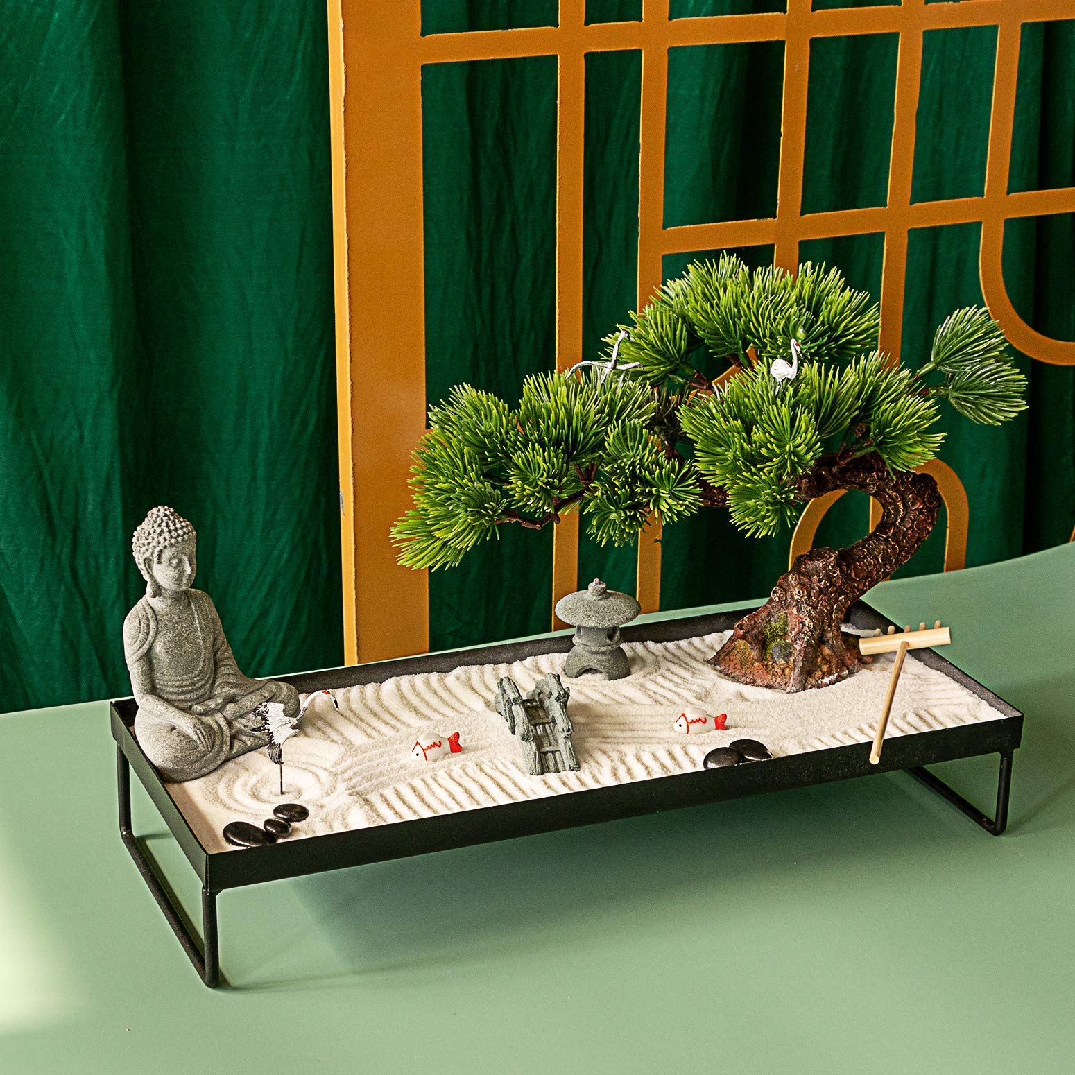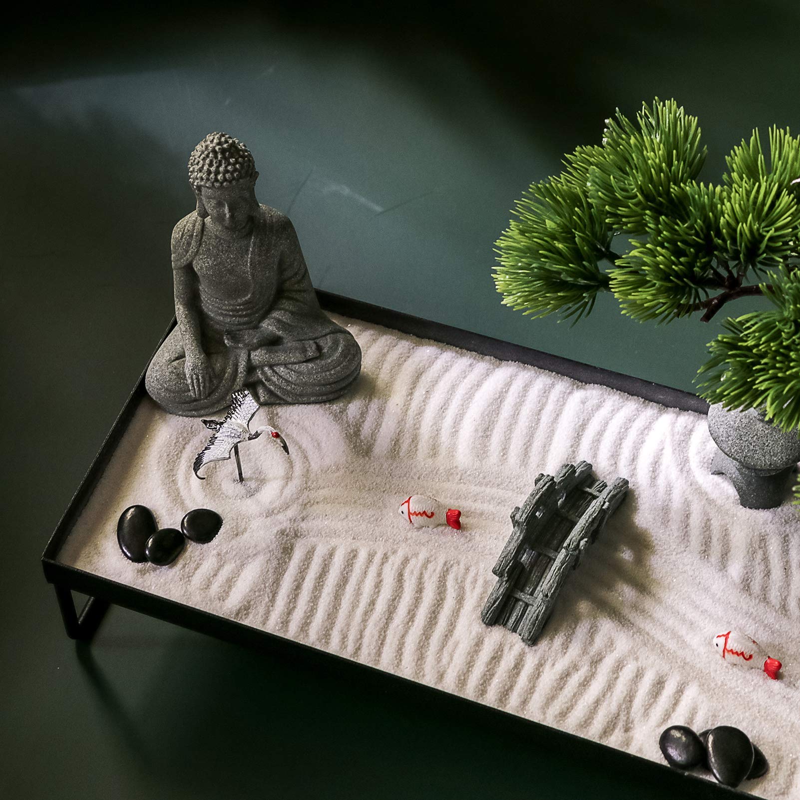 - 🌸HIGH QUALITY AND DURABLE - This Zen garden kit has 18 items: 14" X 5.7" X 2.4" large decorative iron tray, hand carved stone bridge, stone pagoda, meditation stone Buddha, black nature river stones, white sand, bamboo rake, cranes, artificial bonsai pine tree and 2 koi! Can be placed in your Zen room, home or office in a quiet meditation corner. Enjoy your own private Zen garden time, even if your space is small.