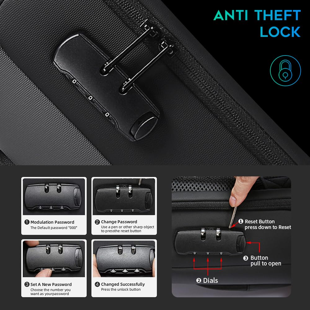 - ANTI THEFT BACKPACK: The computer backpack is equipped with a smart secure lock that is made of high strength zinc alloy with a solid, compact body to prevent theft and well safeguard all your valuables securely. The password lock is easy to set (Includes instructions), please see A+ for the detailed instruction.