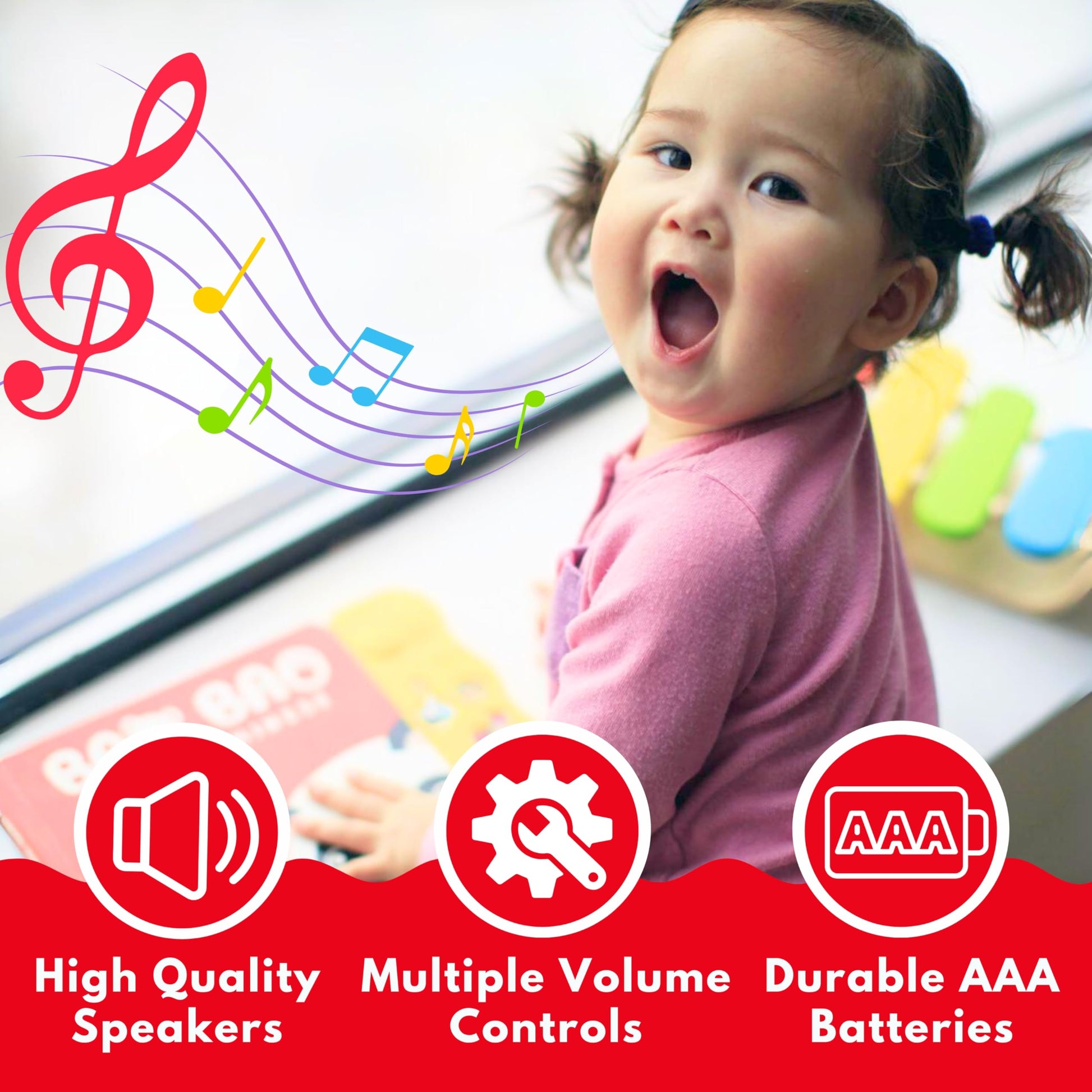 - BEAUTIFUL, DURABLE AND SAFE. The perfect board book and a great gift for newborn infants, babies, one year olds, two year olds, three year olds and all toddlers. Non-tearing board book pages. Batteries included. Comes with easy volume controls and mute options.