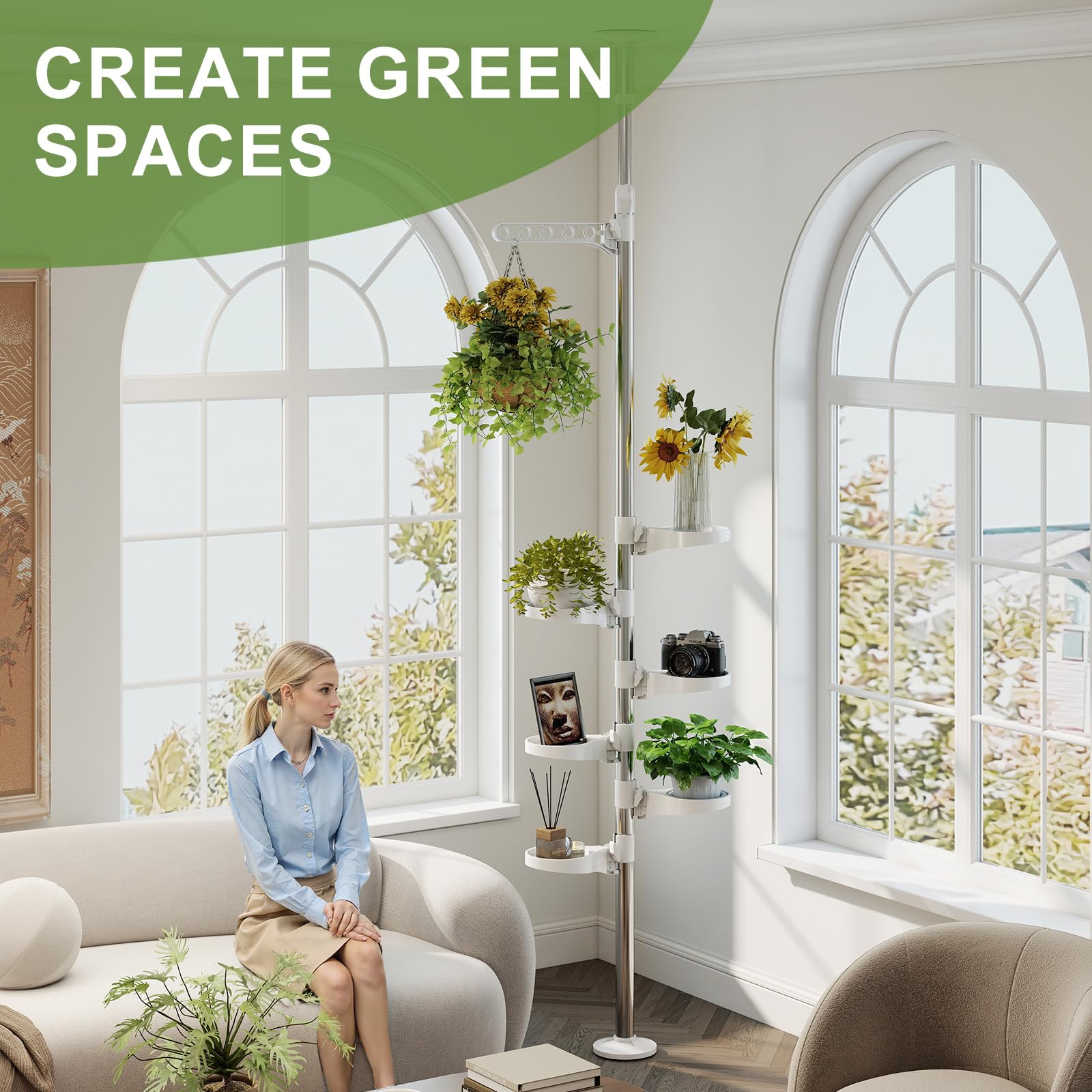 - MULTI-FUNCTION: Rust-proof tension pole adjustable plant stands/flower racks/ clothes hanging rod, allows indoor/balcony/window use,designed for plant hangers, flower pot display and clothes hanging rod.