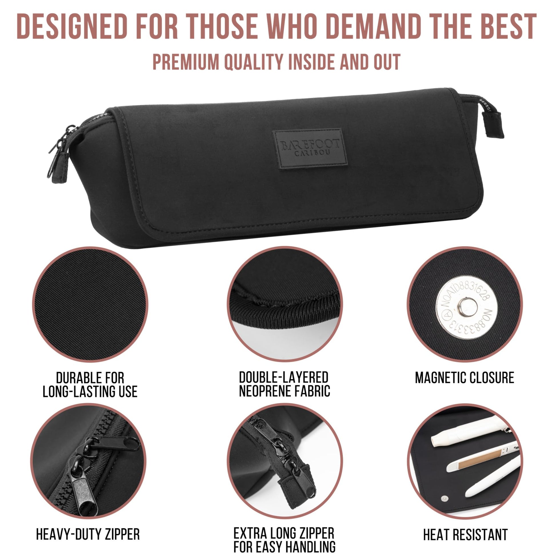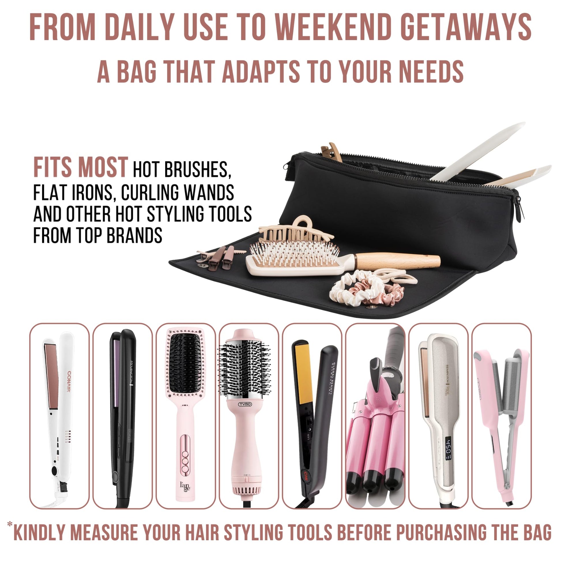 BAREFOOT CARIBOU Hair Tools Travel Bag and Heat Resistant Mat for Flat Irons, Straighteners, Curling Iron, and Haircare Accessories, 2-in-1 Design, with Interior Pockets, Portable Organizer (Black)