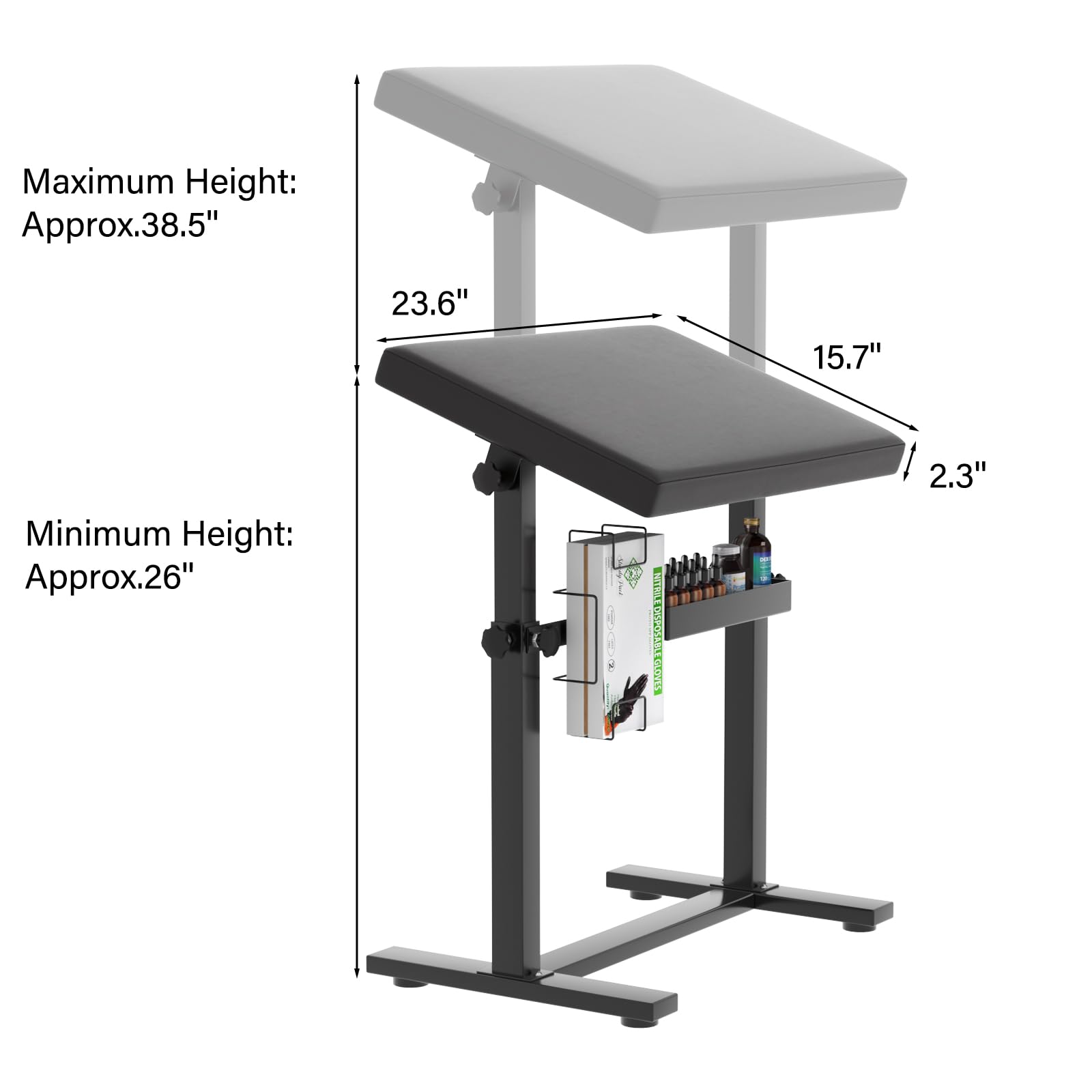 - 【Storage Design】The tattoo armrest stand comes with a storage box and rack, providing convenient storage for pigments, gloves, and other accessories during your work. The tattoo armrest stand also has a special design to fix the arm or leg, allowing the tattoo artist to easily work on more complex designs.